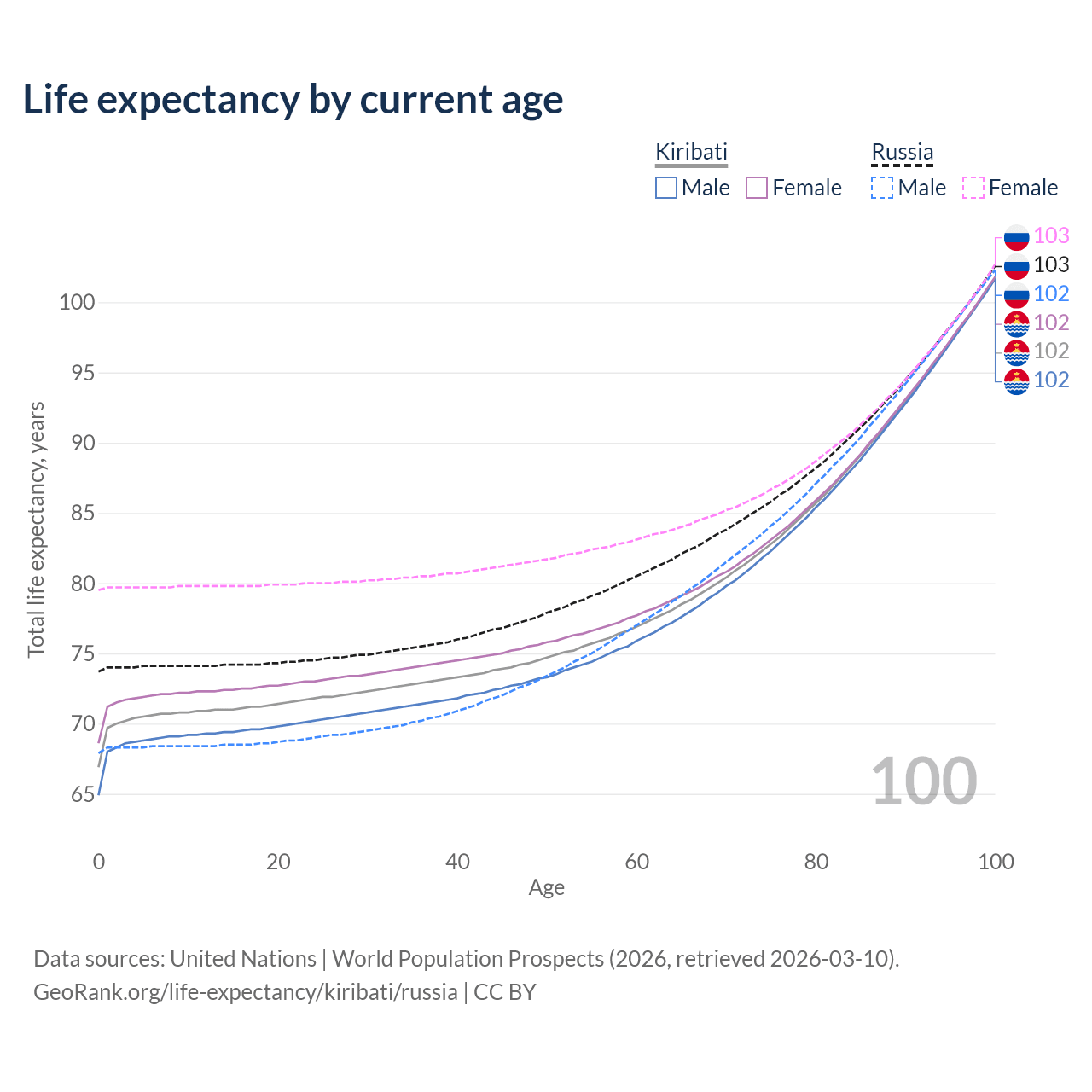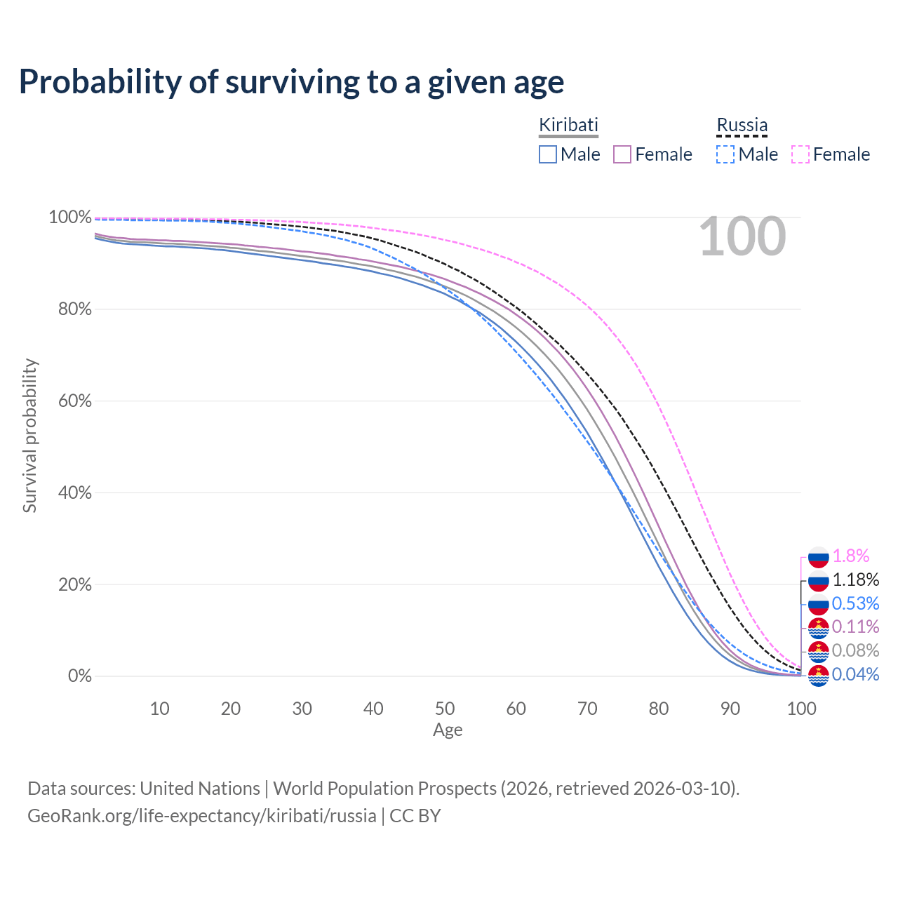 This life expectancy calculator shows the odds of living to 100, 95, 90, and below based on current age for both males and females in Kiribati and Russia, along with mean and median age of death. The calculations are based on the 2026 life tables (actuarial tables) from the UN World Population Prospects.