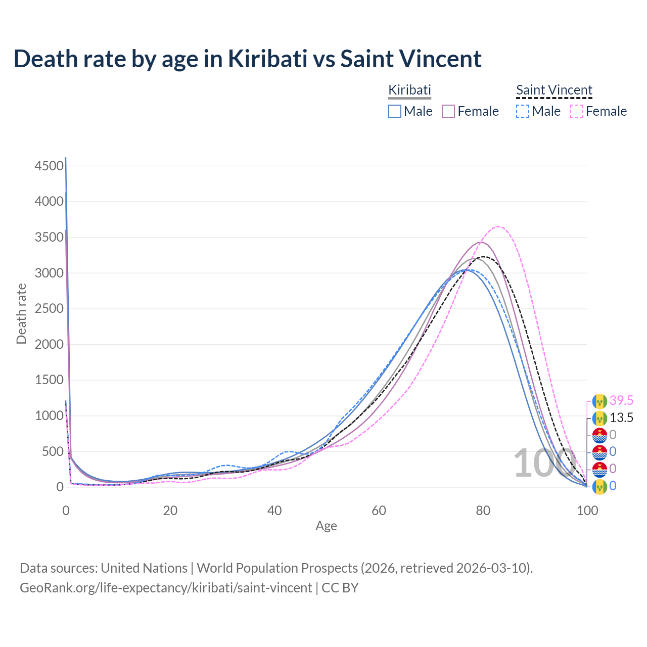 In Kiribati, the most common age of death is 0, compared to 80 in Saint Vincent. The median age of death is 73.1 in Kiribati and 75.6 in Saint Vincent, meaning only half of each cohort is expected to live past that age.