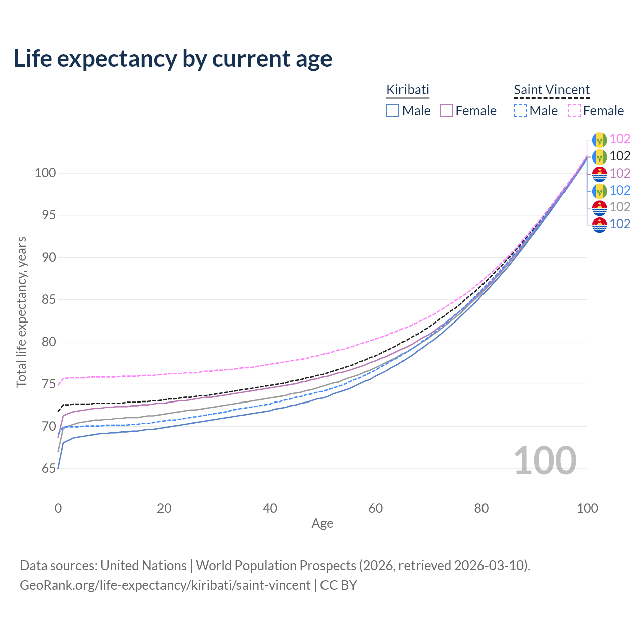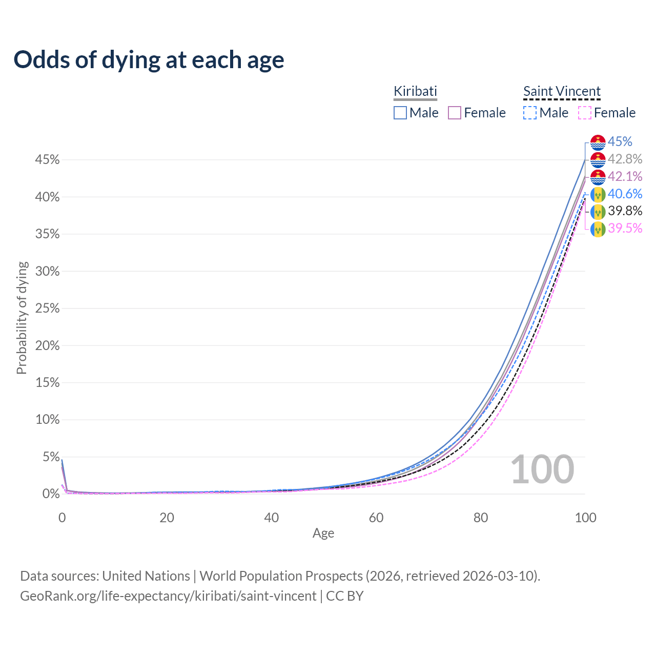 This life expectancy calculator shows the odds of living to 100, 95, 90, and below based on current age for both males and females in Kiribati and Saint Vincent, along with mean and median age of death. The calculations are based on the 2026 life tables (actuarial tables) from the UN World Population Prospects.