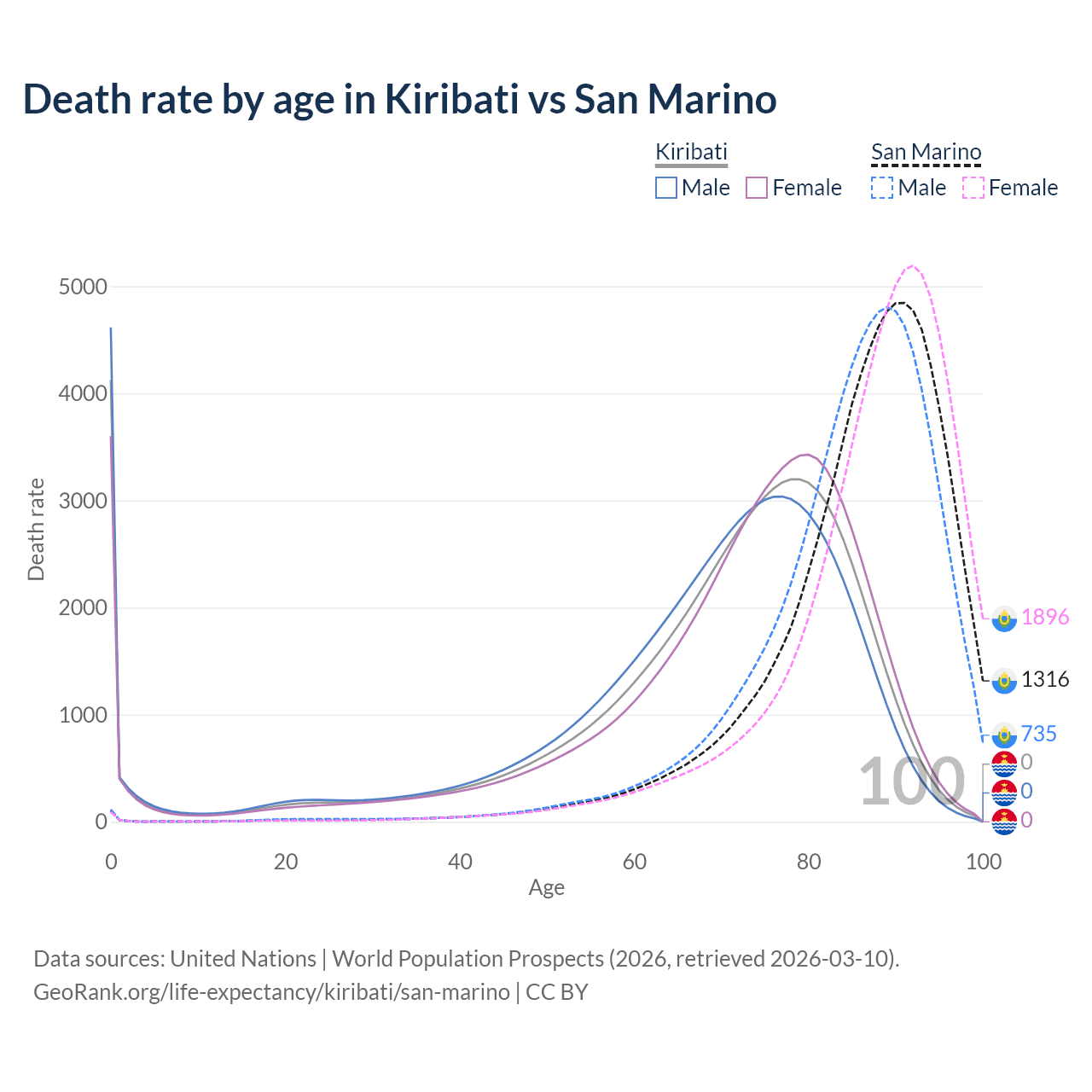 In Kiribati, the most common age of death is 0, compared to 91 in San Marino. The median age of death is 73.1 in Kiribati and 88.3 in San Marino, meaning only half of each cohort is expected to live past that age.