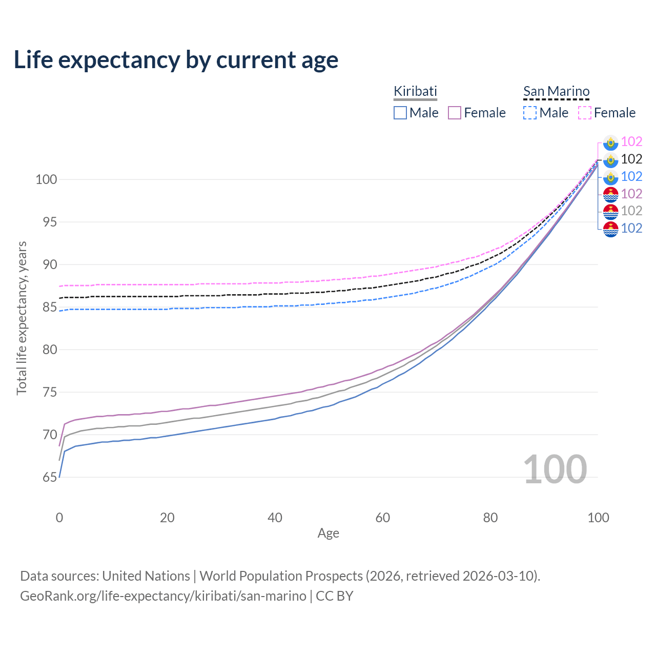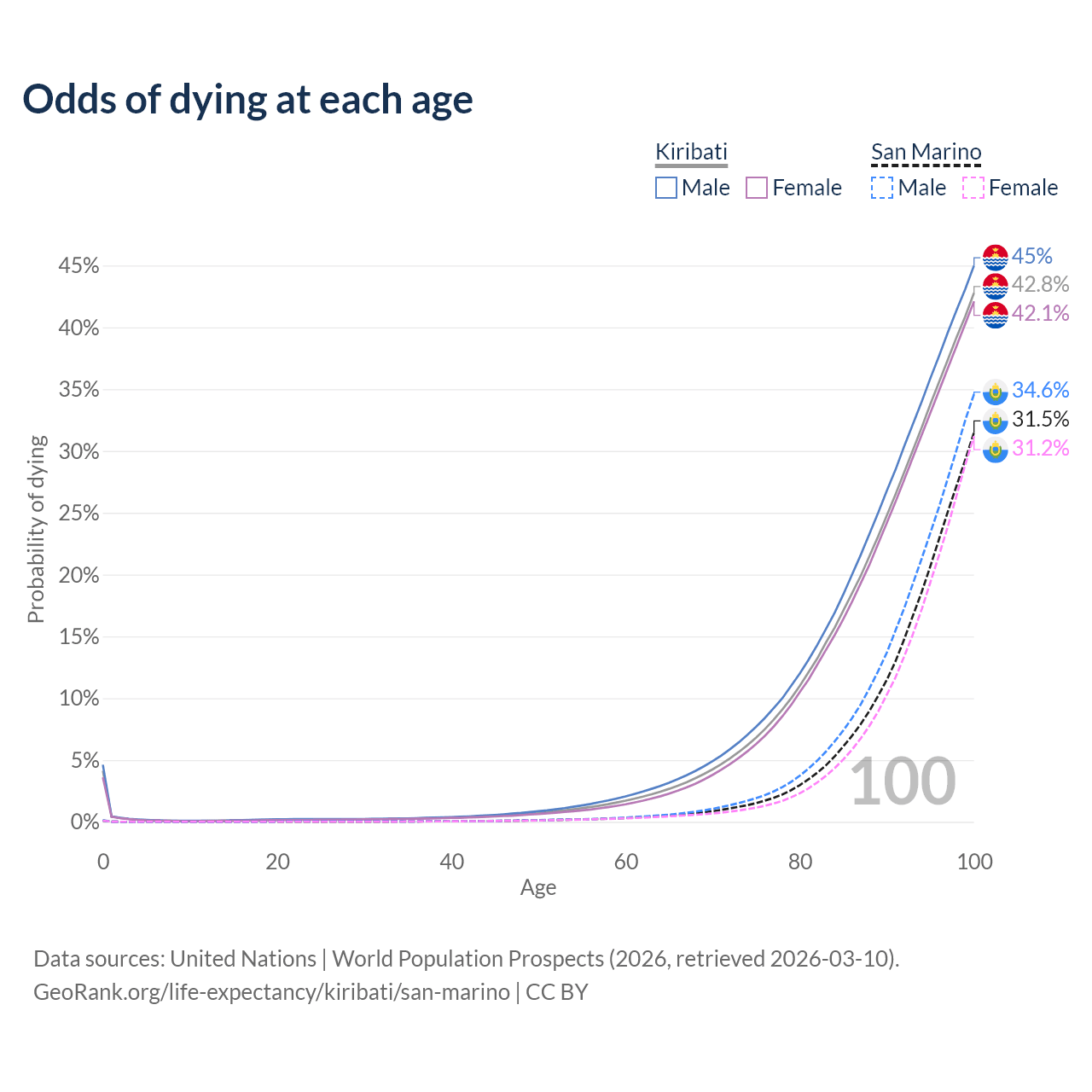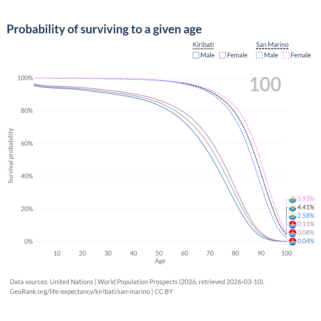 This life expectancy calculator shows the odds of living to 100, 95, 90, and below based on current age for both males and females in Kiribati and San Marino, along with mean and median age of death. The calculations are based on the 2026 life tables (actuarial tables) from the UN World Population Prospects.