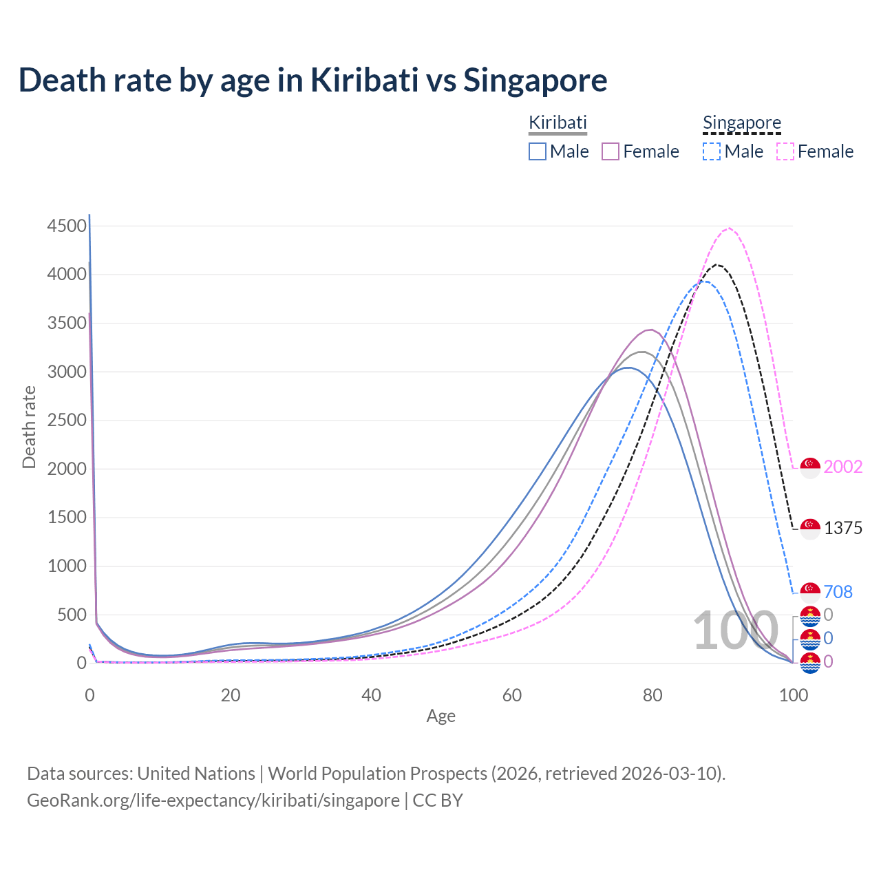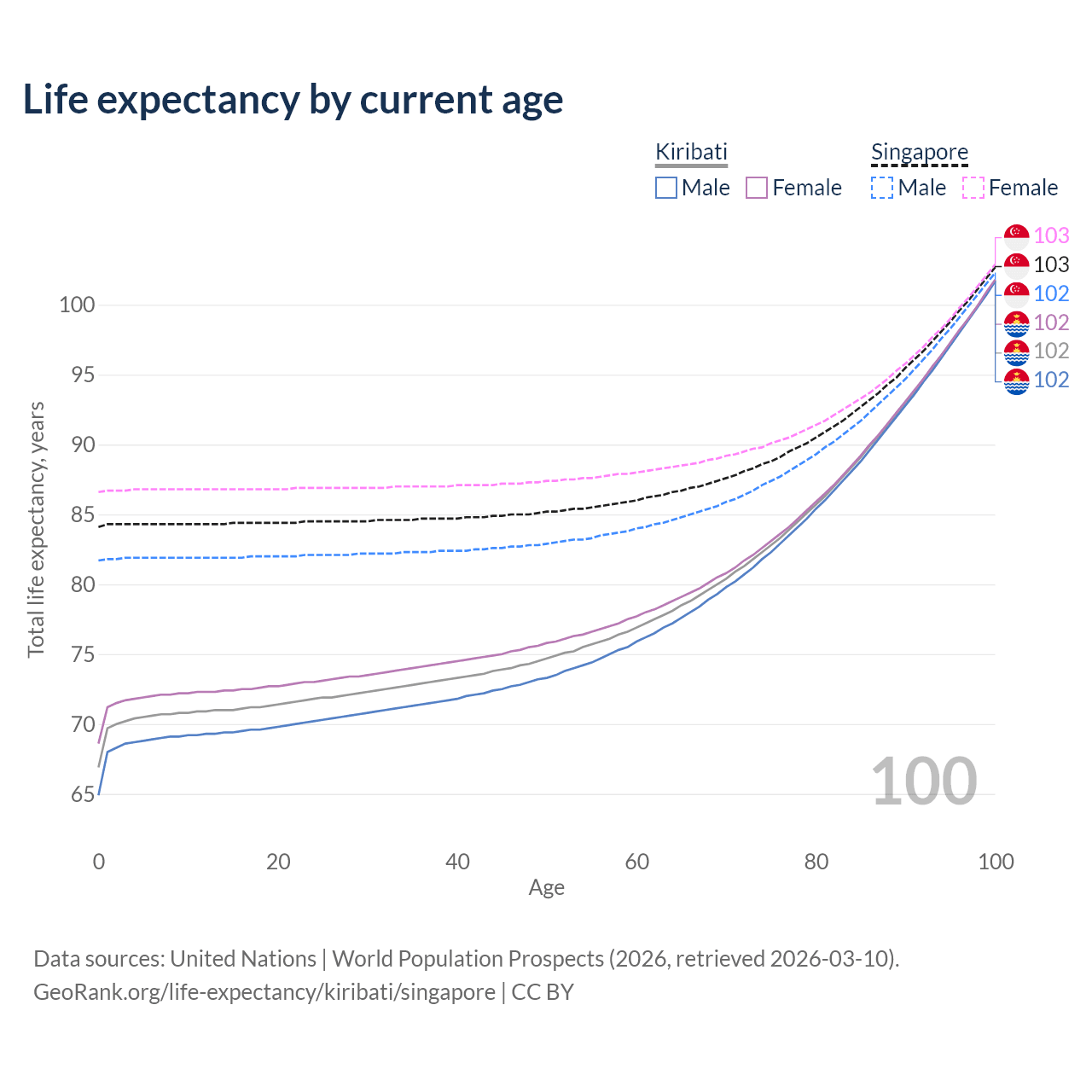 This life expectancy calculator shows the odds of living to 100, 95, 90, and below based on current age for both males and females in Kiribati and Singapore, along with mean and median age of death. The calculations are based on the 2026 life tables (actuarial tables) from the UN World Population Prospects.
