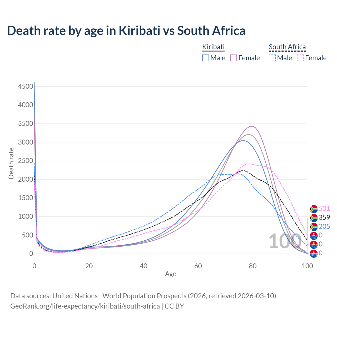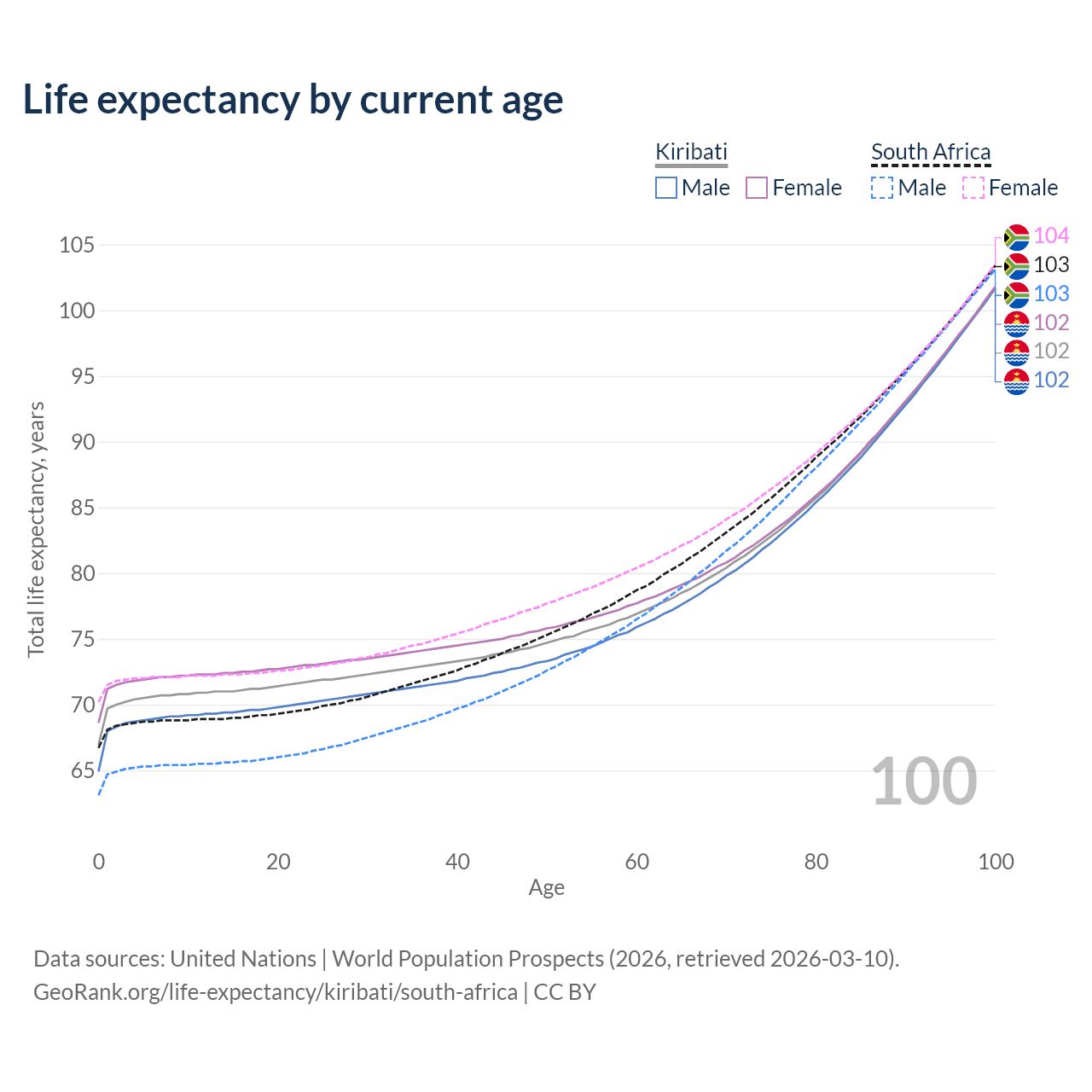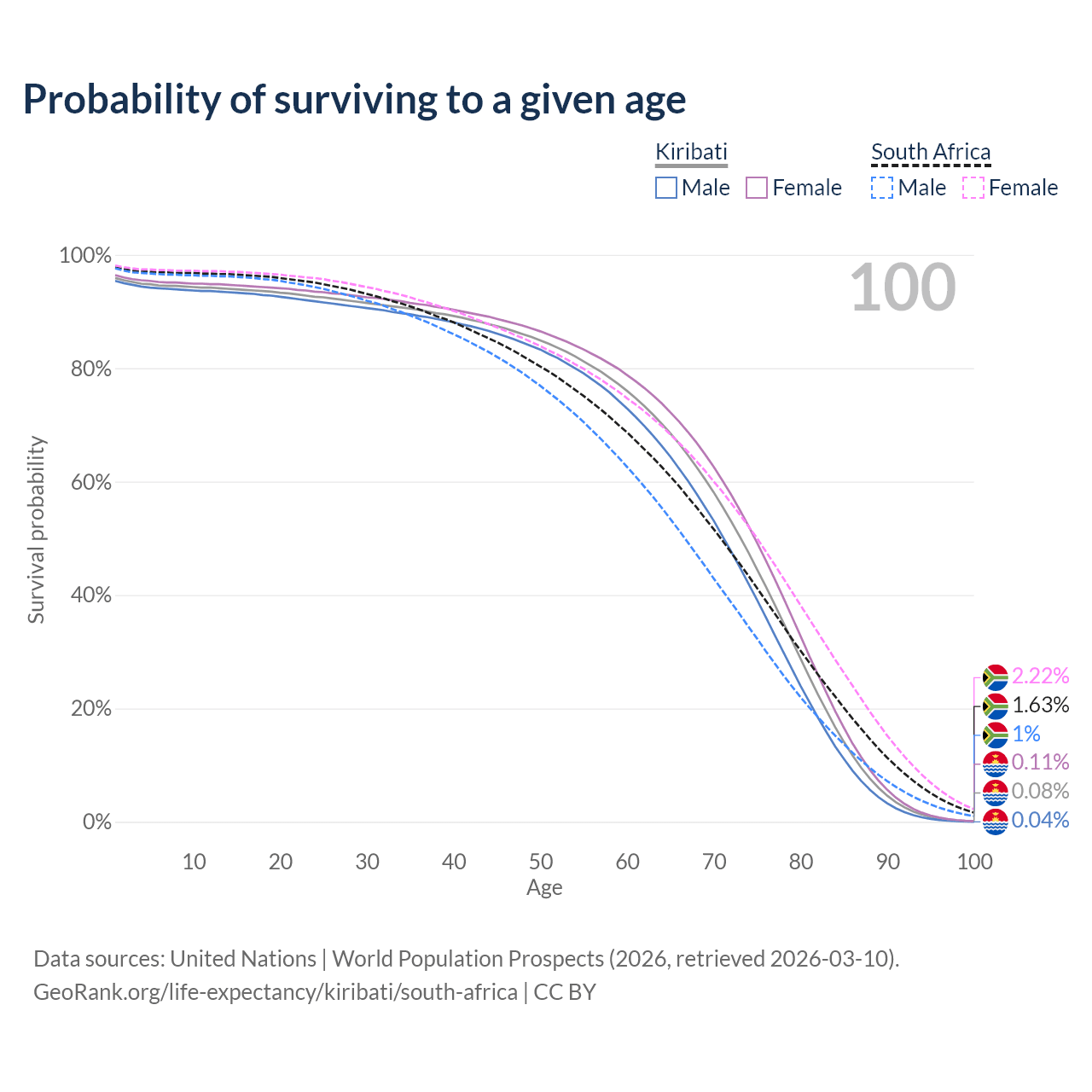 This life expectancy calculator shows the odds of living to 100, 95, 90, and below based on current age for both males and females in Kiribati and South Africa, along with mean and median age of death. The calculations are based on the 2026 life tables (actuarial tables) from the UN World Population Prospects.