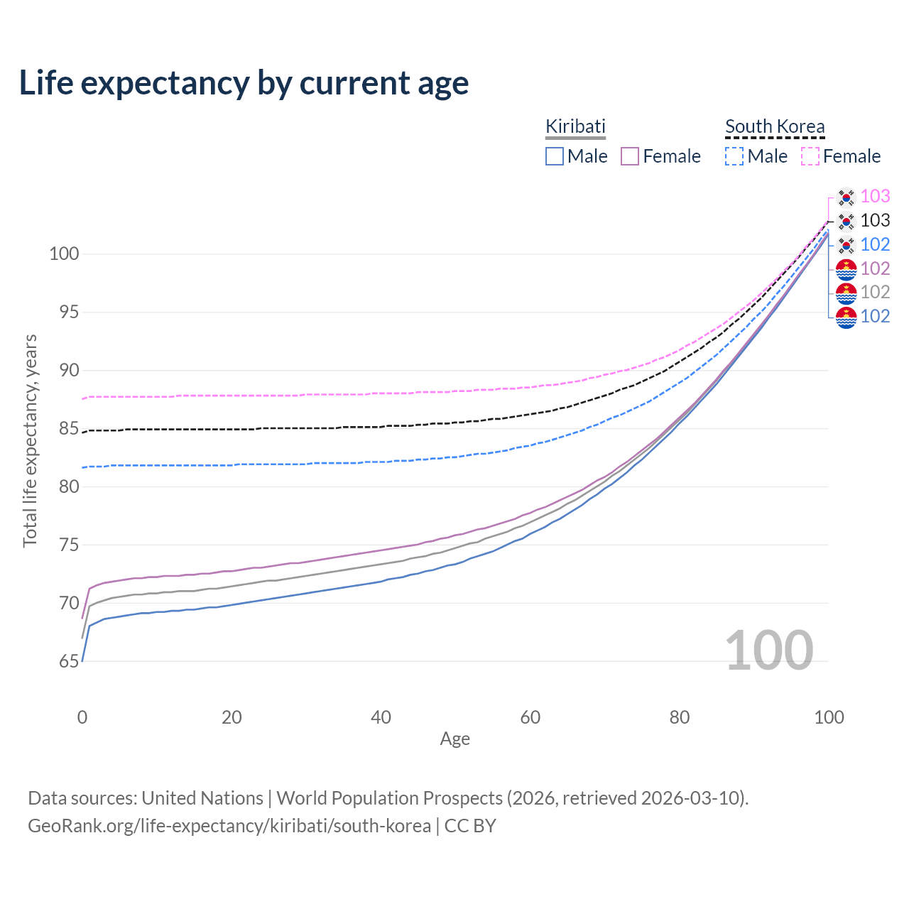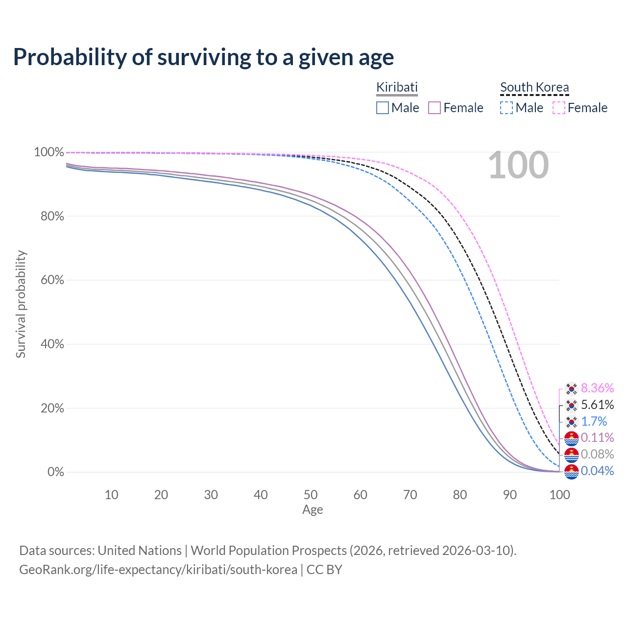 This life expectancy calculator shows the odds of living to 100, 95, 90, and below based on current age for both males and females in Kiribati and South Korea, along with mean and median age of death. The calculations are based on the 2026 life tables (actuarial tables) from the UN World Population Prospects.