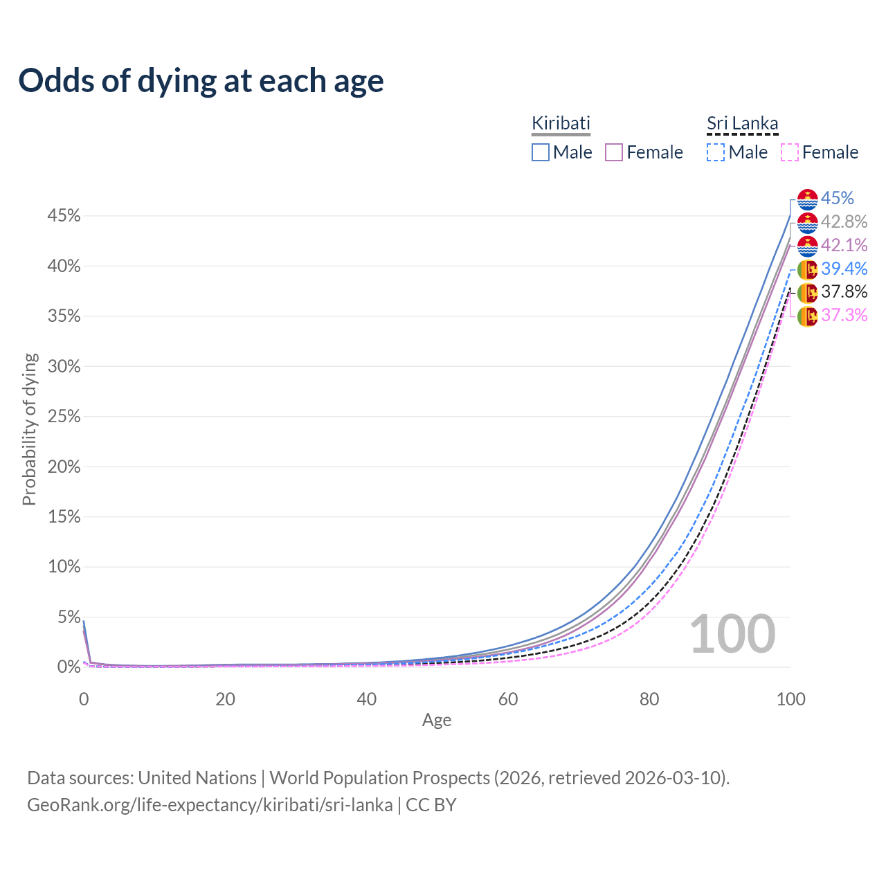 This life expectancy calculator shows the odds of living to 100, 95, 90, and below based on current age for both males and females in Kiribati and Sri Lanka, along with mean and median age of death. The calculations are based on the 2026 life tables (actuarial tables) from the UN World Population Prospects.