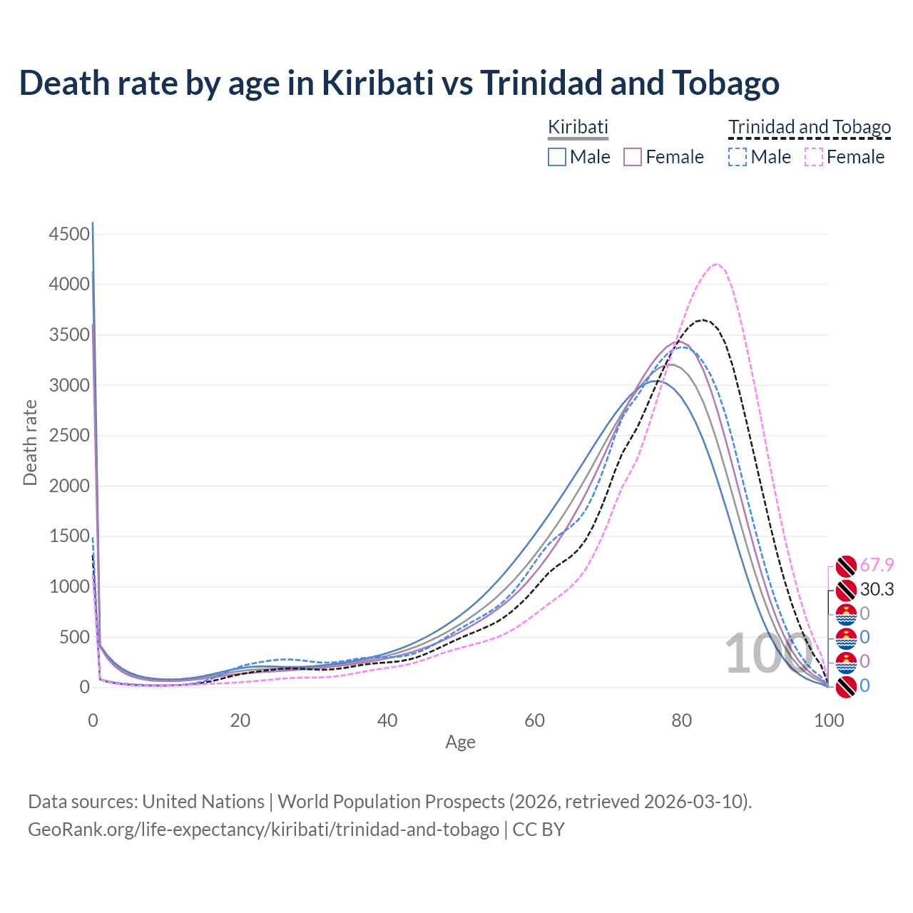 In Kiribati, the most common age of death is 0, compared to 83 in Trinidad and Tobago. The median age of death is 73.1 in Kiribati and 78.4 in Trinidad and Tobago, meaning only half of each cohort is expected to live past that age.
