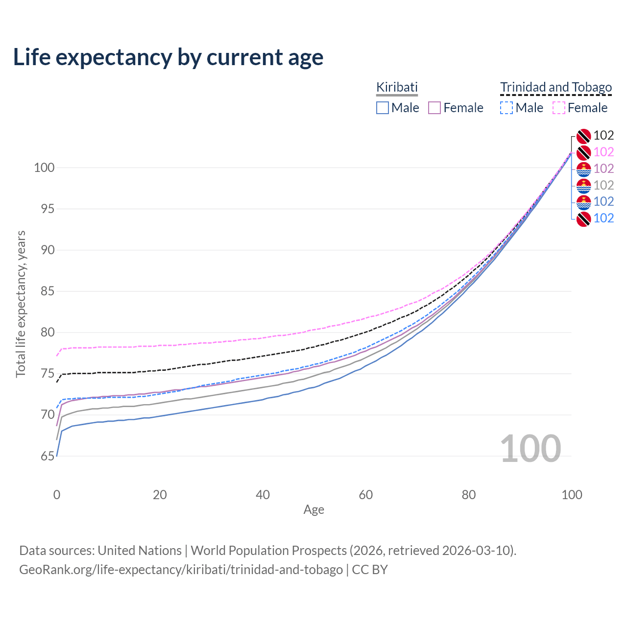 This life expectancy calculator shows the odds of living to 100, 95, 90, and below based on current age for both males and females in Kiribati and Trinidad and Tobago, along with mean and median age of death. The calculations are based on the 2026 life tables (actuarial tables) from the UN World Population Prospects.