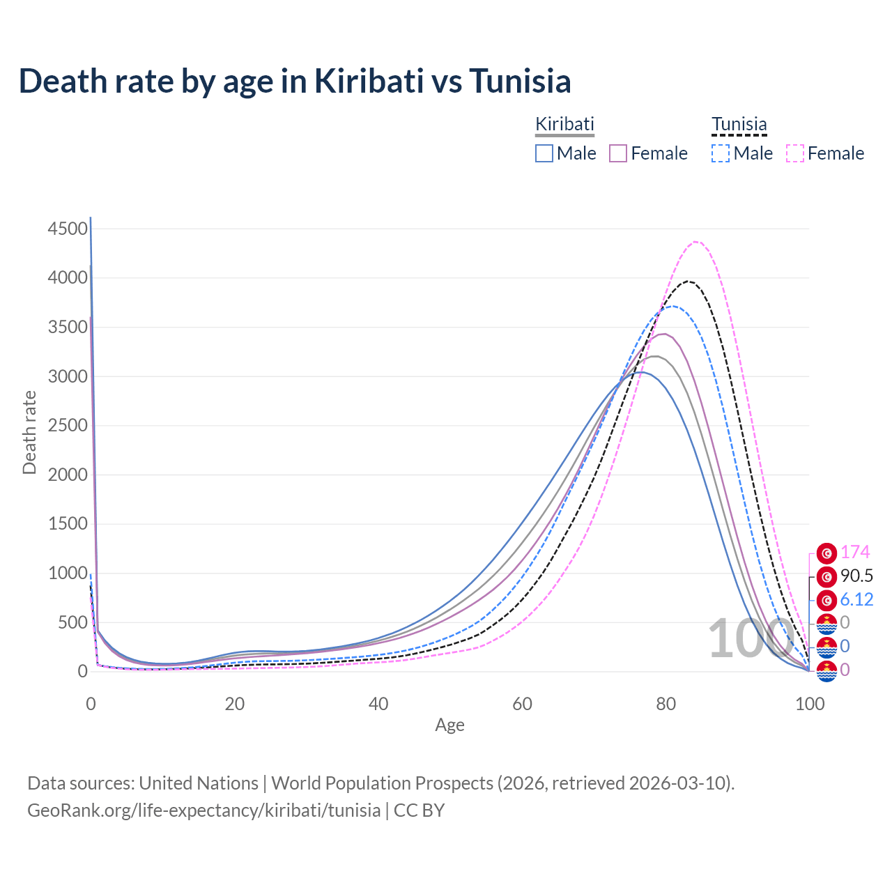 In Kiribati, the most common age of death is 0, compared to 83 in Tunisia. The median age of death is 73.1 in Kiribati and 80.2 in Tunisia, meaning only half of each cohort is expected to live past that age.