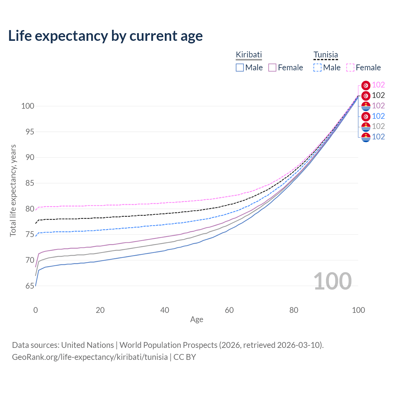 This life expectancy calculator shows the odds of living to 100, 95, 90, and below based on current age for both males and females in Kiribati and Tunisia, along with mean and median age of death. The calculations are based on the 2026 life tables (actuarial tables) from the UN World Population Prospects.
