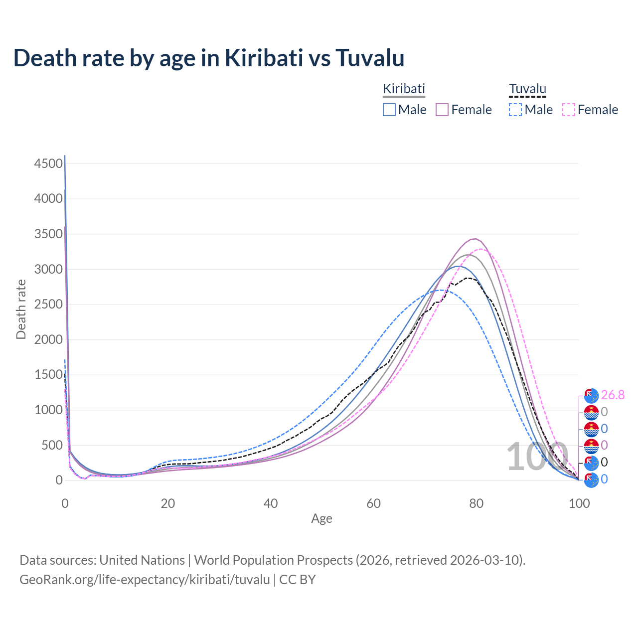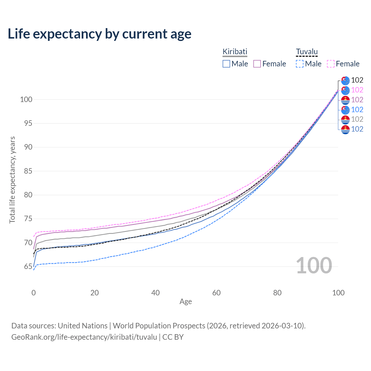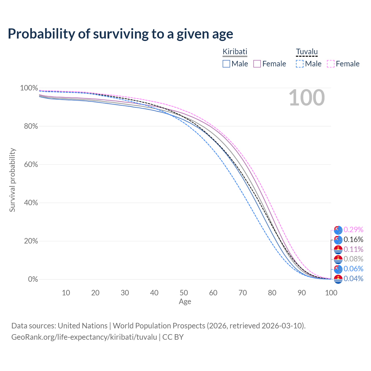 This life expectancy calculator shows the odds of living to 100, 95, 90, and below based on current age for both males and females in Kiribati and Tuvalu, along with mean and median age of death. The calculations are based on the 2026 life tables (actuarial tables) from the UN World Population Prospects.