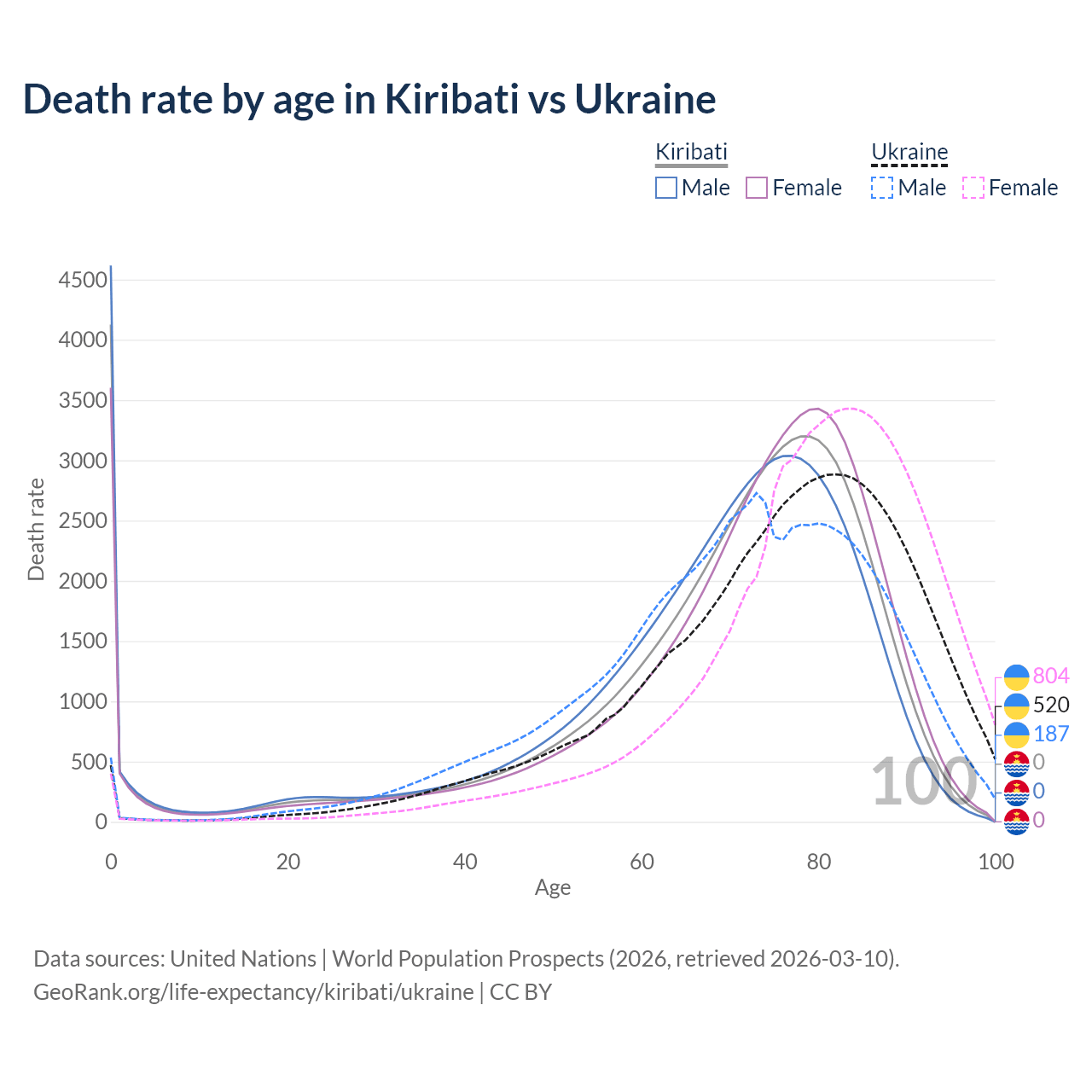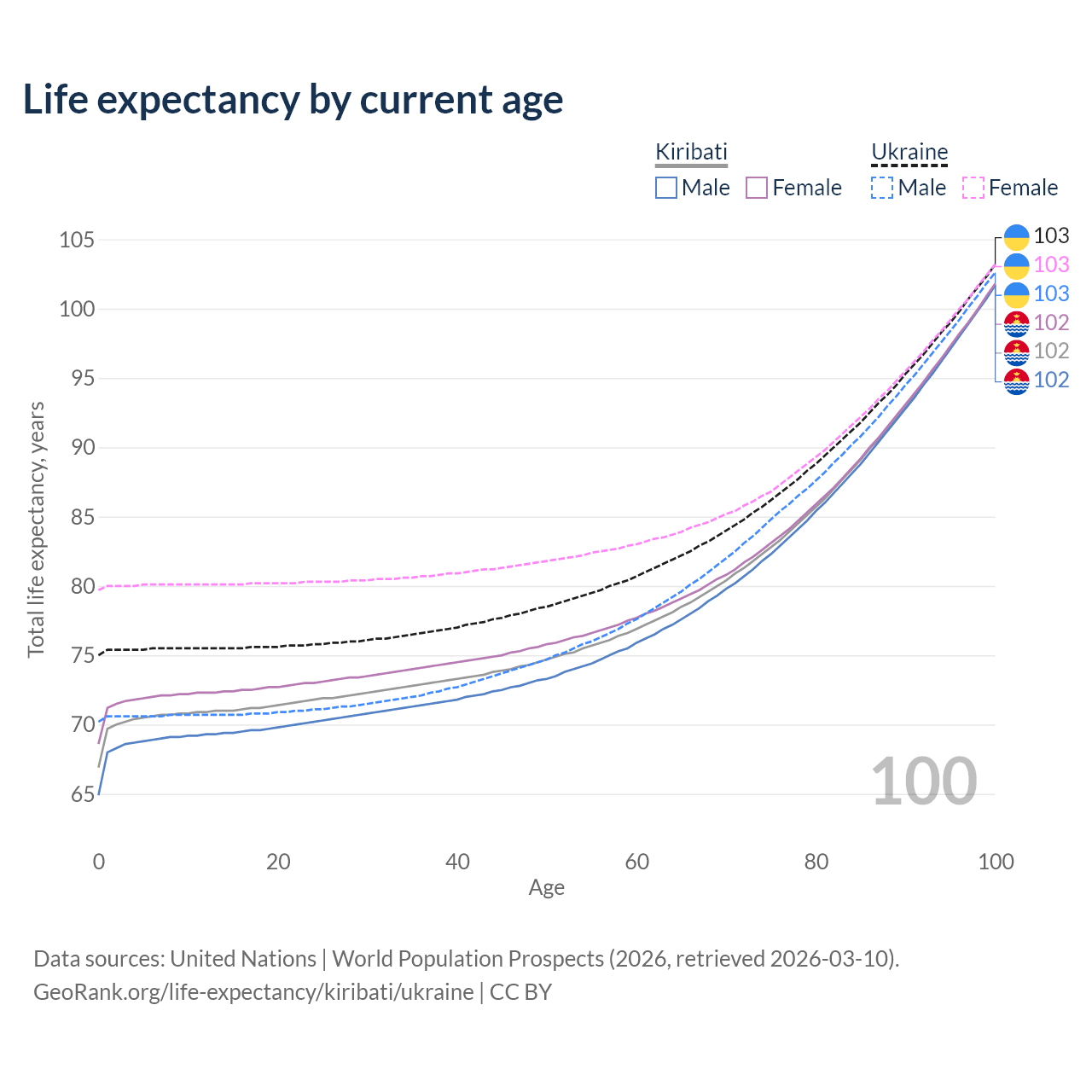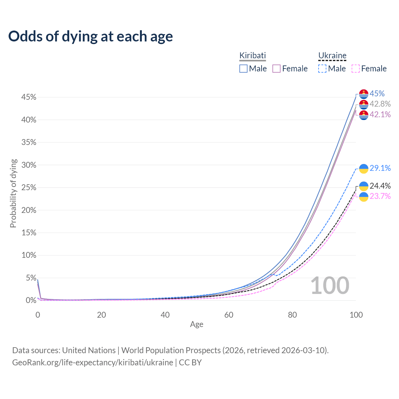 This life expectancy calculator shows the odds of living to 100, 95, 90, and below based on current age for both males and females in Kiribati and Ukraine, along with mean and median age of death. The calculations are based on the 2026 life tables (actuarial tables) from the UN World Population Prospects.