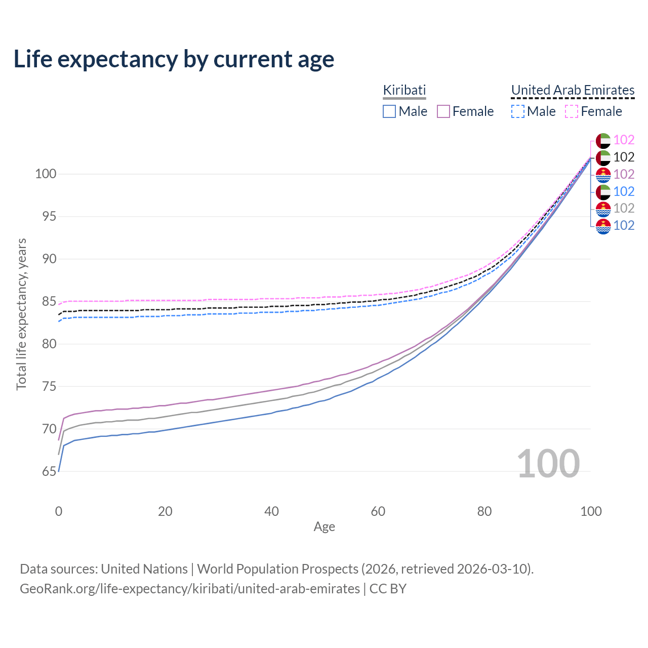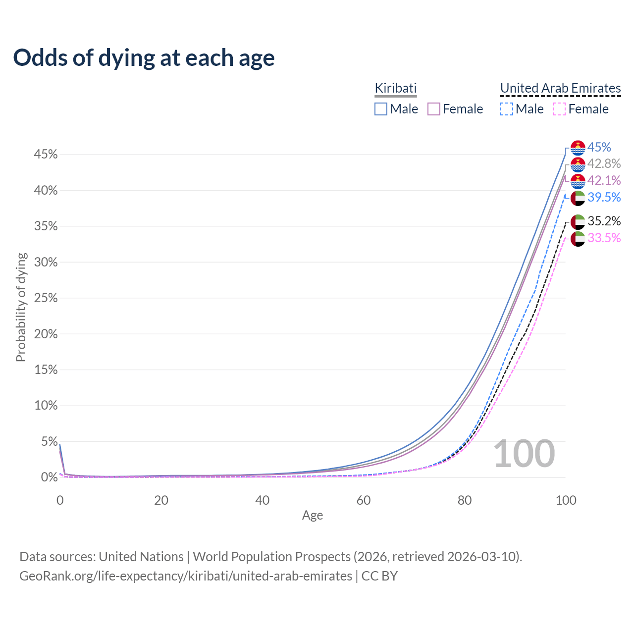 This life expectancy calculator shows the odds of living to 100, 95, 90, and below based on current age for both males and females in Kiribati and the United Arab Emirates, along with mean and median age of death. The calculations are based on the 2026 life tables (actuarial tables) from the UN World Population Prospects.