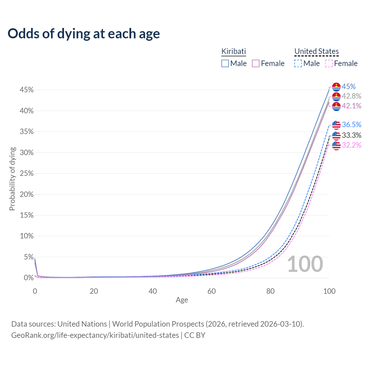 This life expectancy calculator shows the odds of living to 100, 95, 90, and below based on current age for both males and females in Kiribati and the United States, along with mean and median age of death. The calculations are based on the 2026 life tables (actuarial tables) from the UN World Population Prospects.