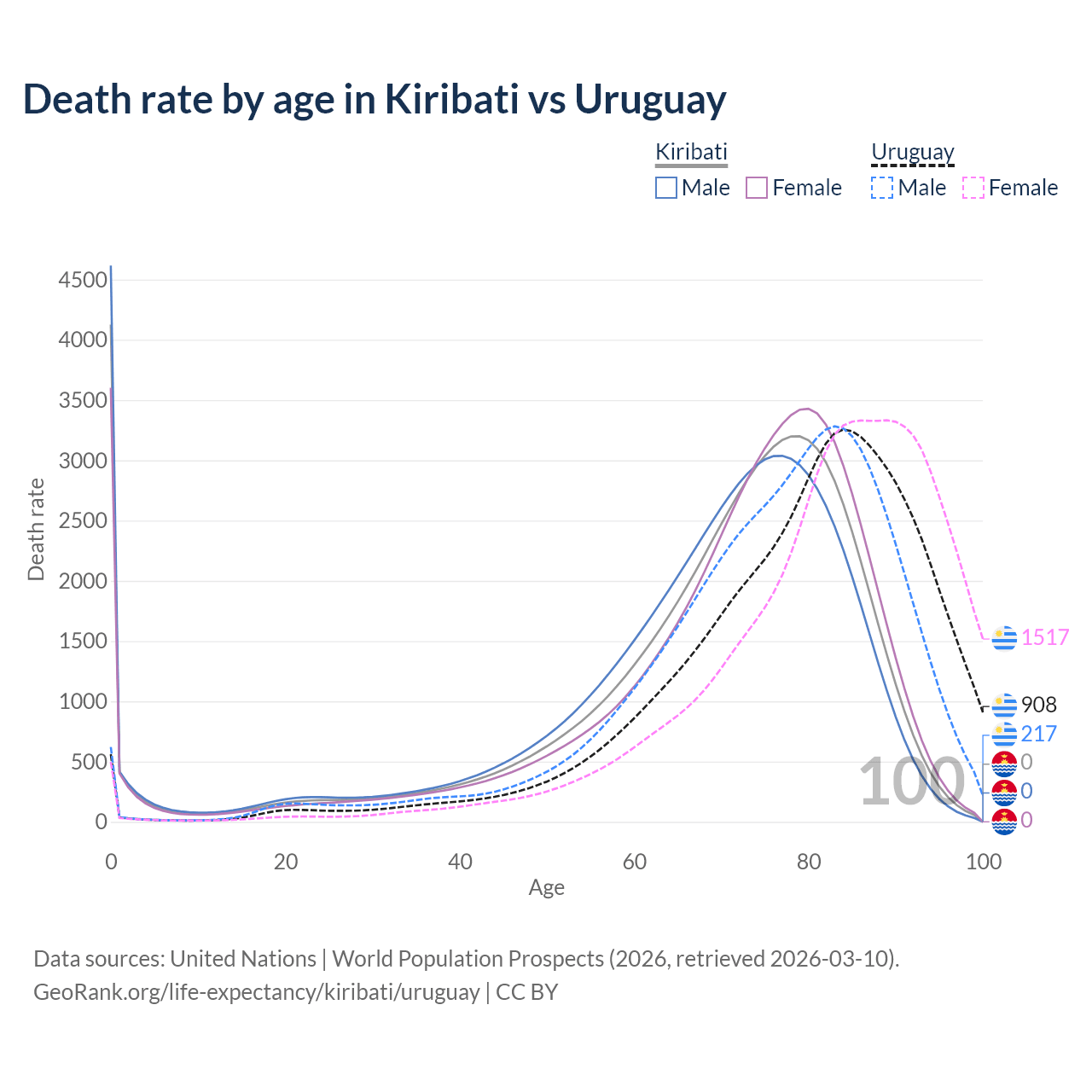 In Kiribati, the most common age of death is 0, compared to 84 in Uruguay. The median age of death is 73.1 in Kiribati and 81.8 in Uruguay, meaning only half of each cohort is expected to live past that age.