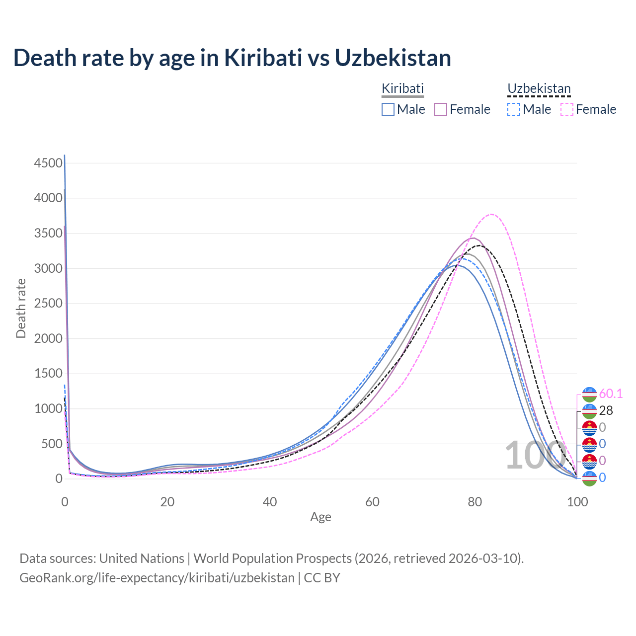 In Kiribati, the most common age of death is 0, compared to 81 in Uzbekistan. The median age of death is 73.1 in Kiribati and 76.4 in Uzbekistan, meaning only half of each cohort is expected to live past that age.