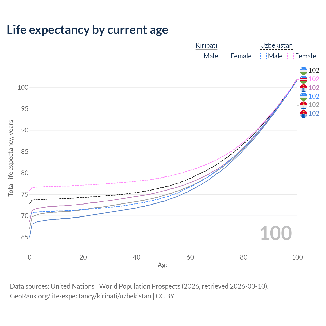 This life expectancy calculator shows the odds of living to 100, 95, 90, and below based on current age for both males and females in Kiribati and Uzbekistan, along with mean and median age of death. The calculations are based on the 2026 life tables (actuarial tables) from the UN World Population Prospects.