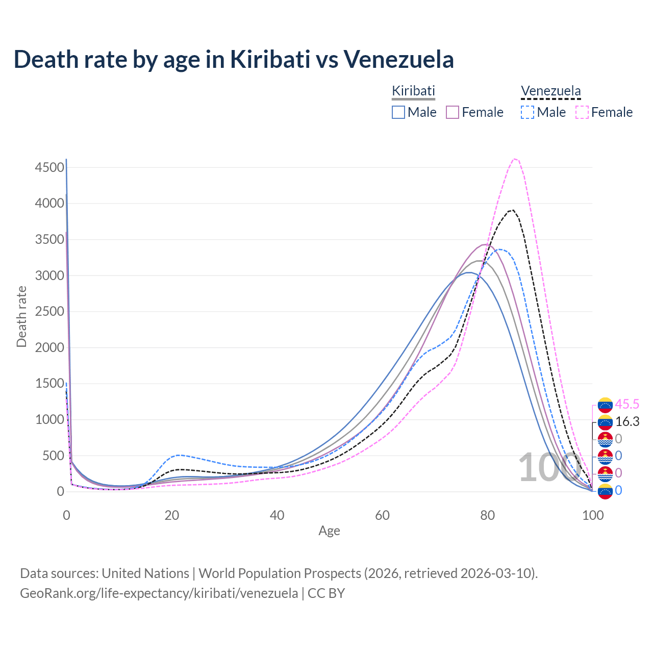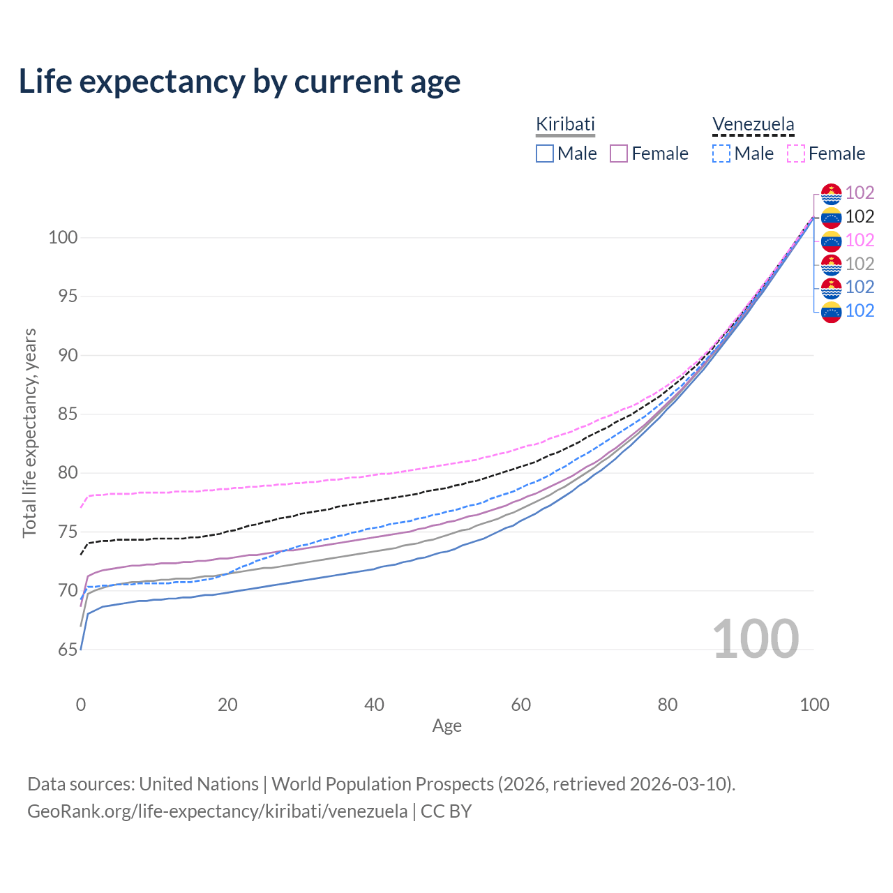 This life expectancy calculator shows the odds of living to 100, 95, 90, and below based on current age for both males and females in Kiribati and Venezuela, along with mean and median age of death. The calculations are based on the 2026 life tables (actuarial tables) from the UN World Population Prospects.