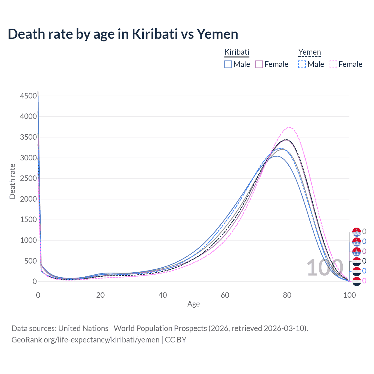 In Kiribati, the most common age of death is 0, compared to 80 in Yemen. The median age of death is 73.1 in Kiribati and 74.9 in Yemen, meaning only half of each cohort is expected to live past that age.