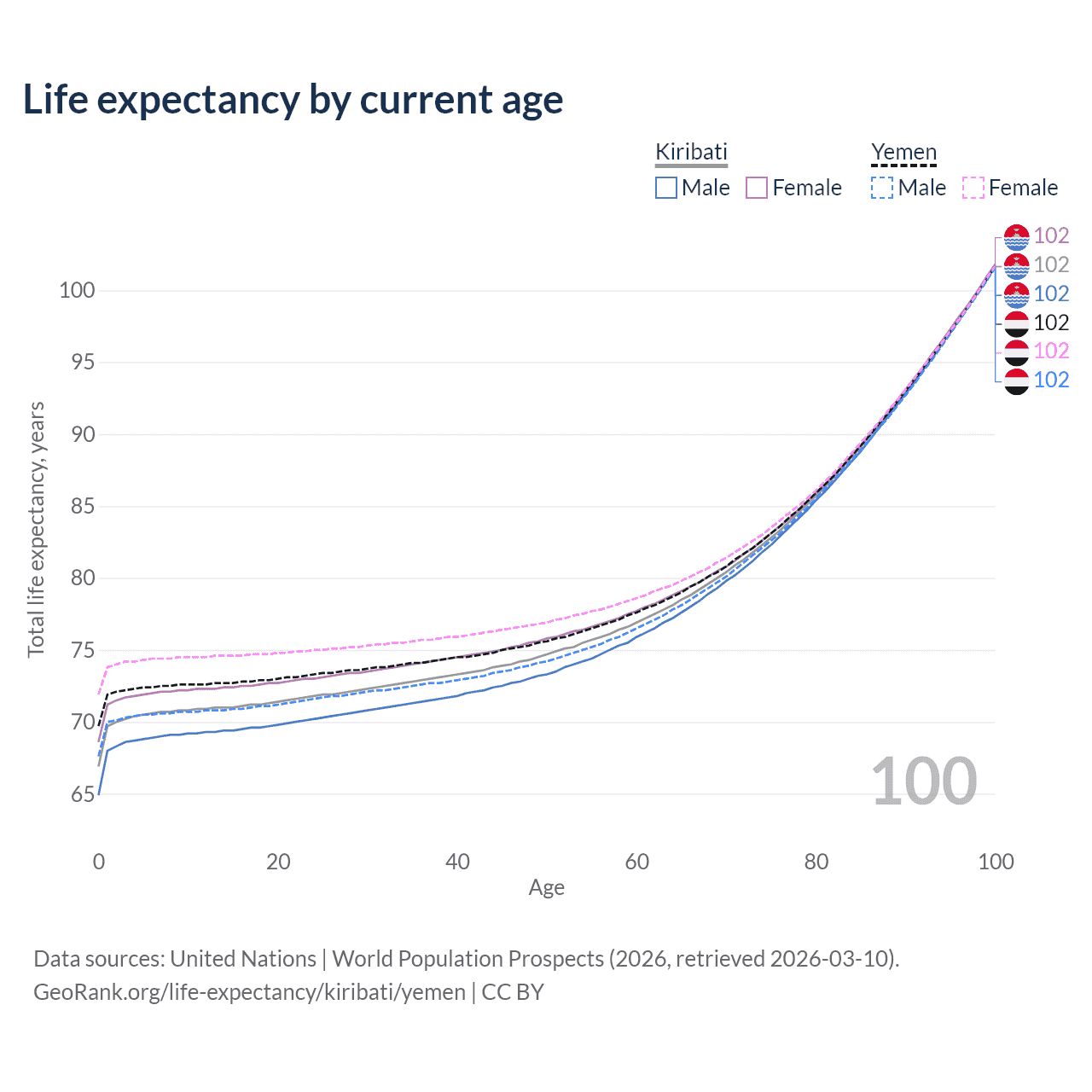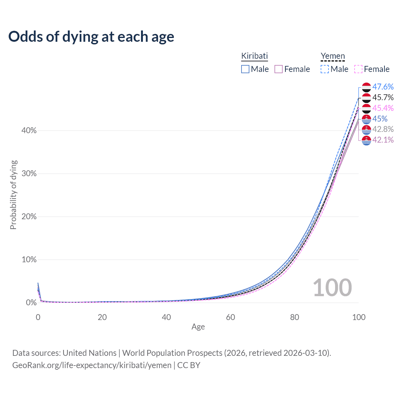 This life expectancy calculator shows the odds of living to 100, 95, 90, and below based on current age for both males and females in Kiribati and Yemen, along with mean and median age of death. The calculations are based on the 2026 life tables (actuarial tables) from the UN World Population Prospects.