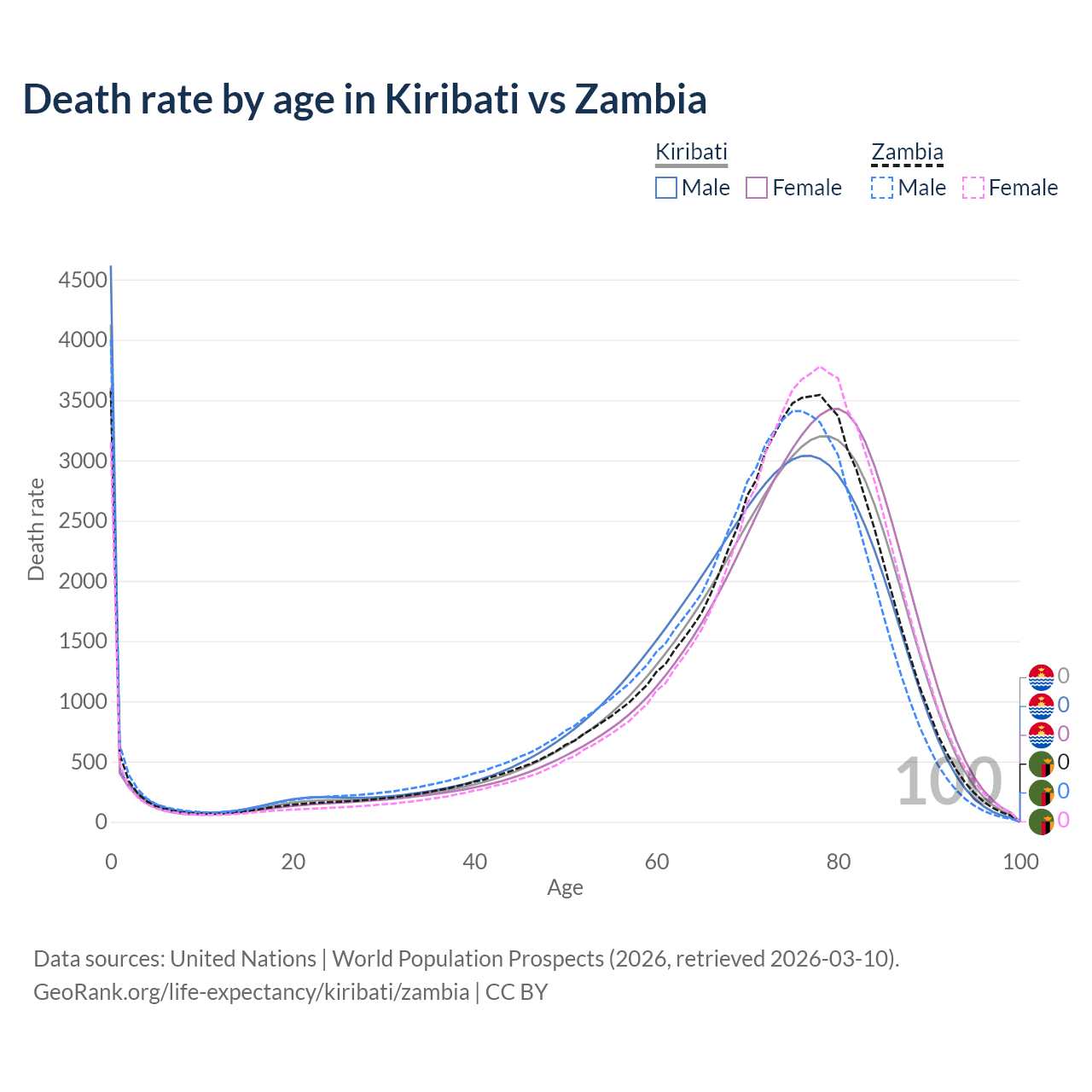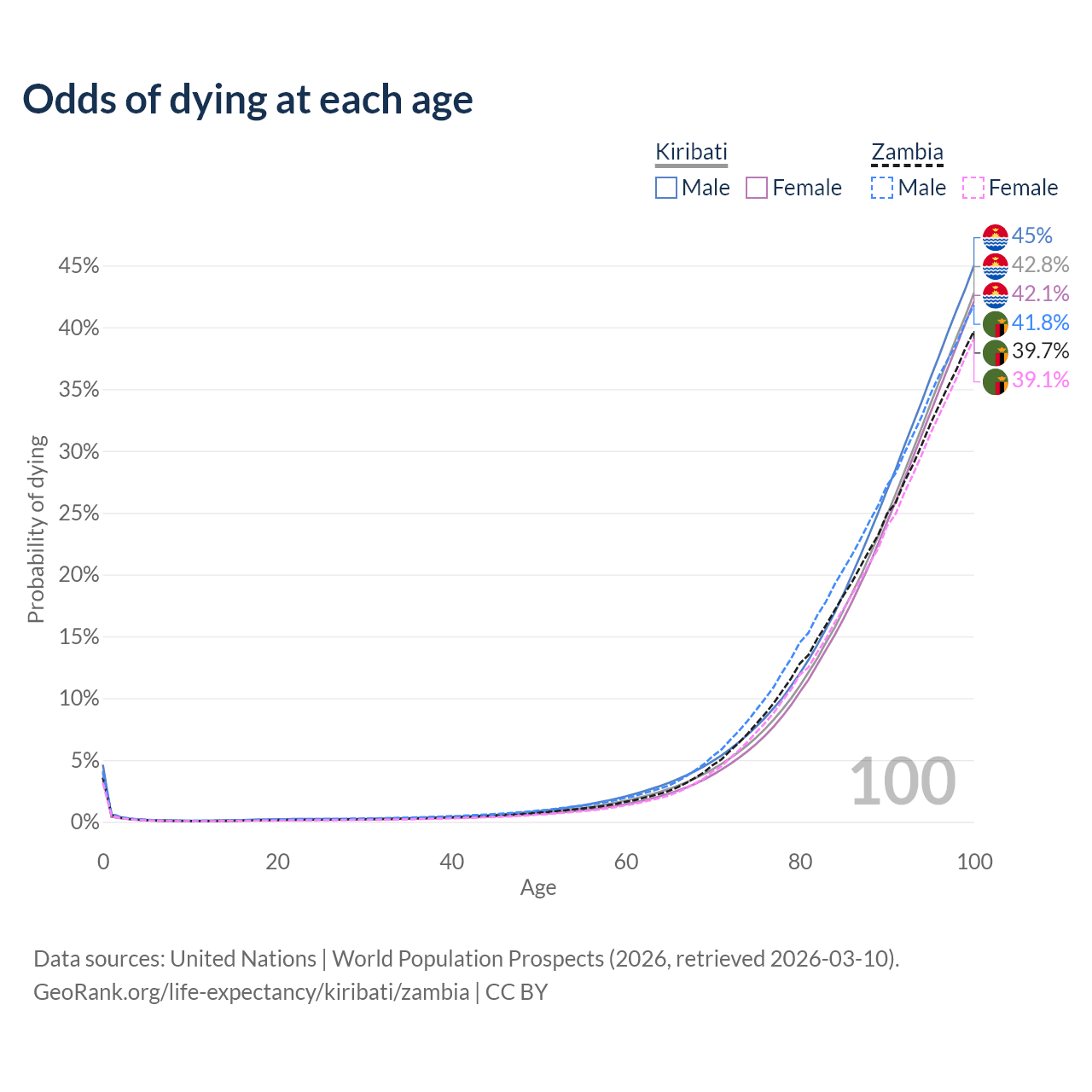 This life expectancy calculator shows the odds of living to 100, 95, 90, and below based on current age for both males and females in Kiribati and Zambia, along with mean and median age of death. The calculations are based on the 2026 life tables (actuarial tables) from the UN World Population Prospects.