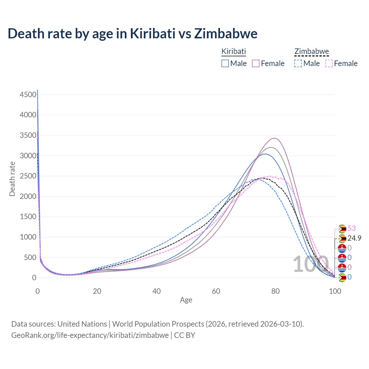 In Kiribati, the most common age of death is 0, compared to 0 in Zimbabwe. The median age of death is 73.1 in Kiribati and 68.8 in Zimbabwe, meaning only half of each cohort is expected to live past that age.