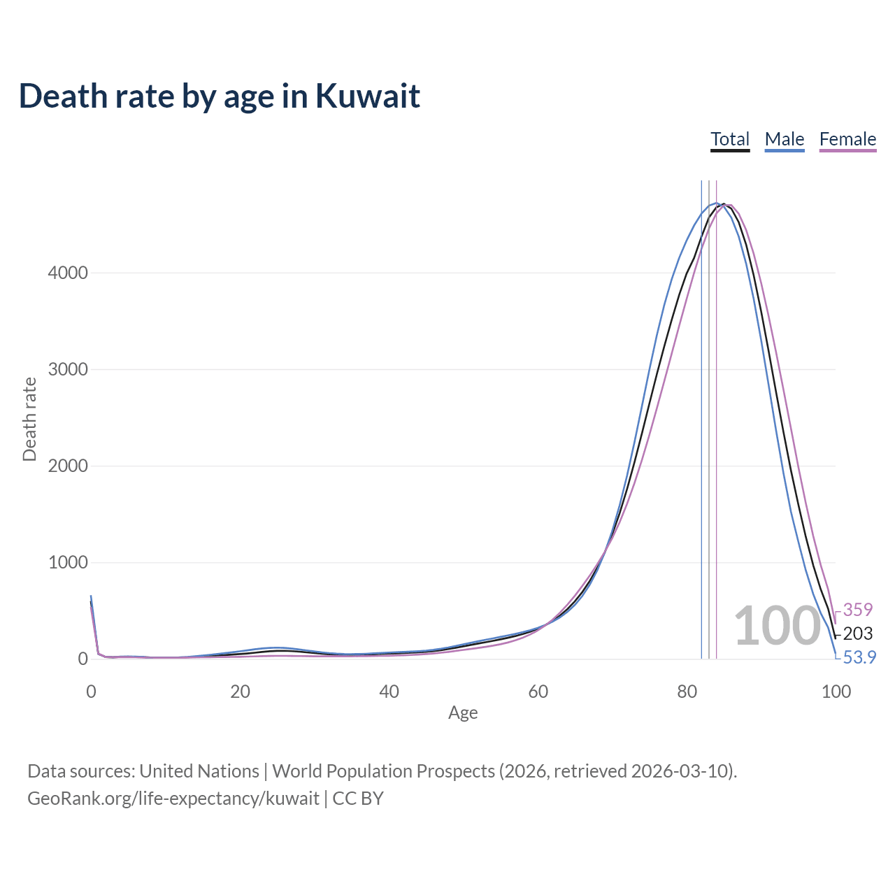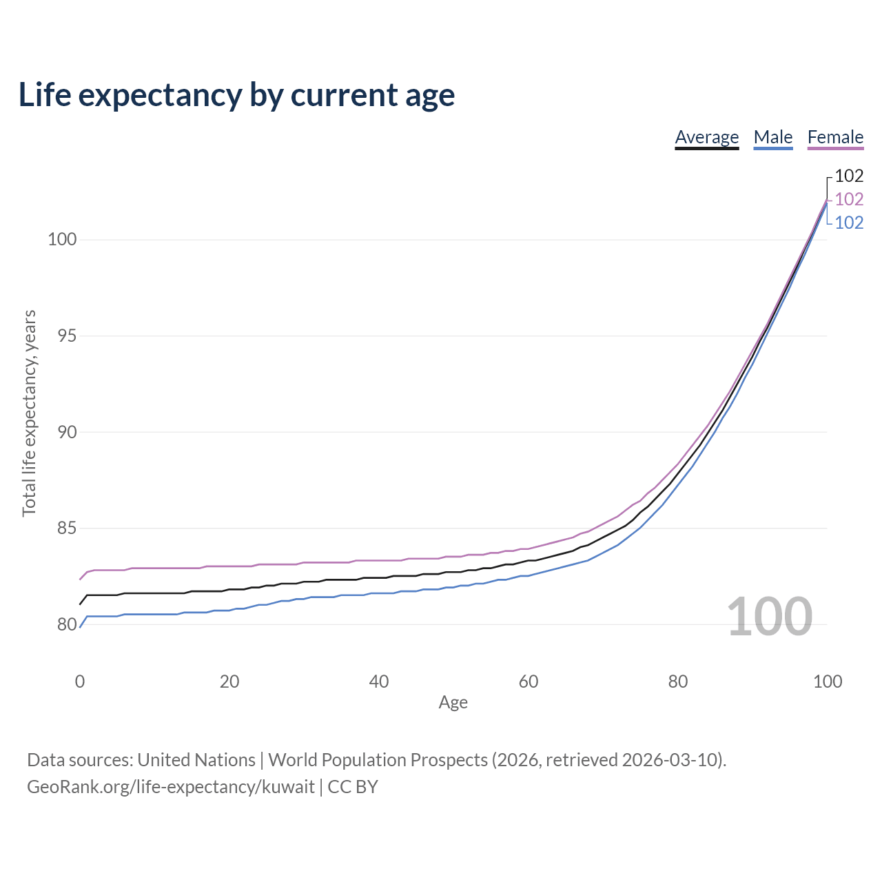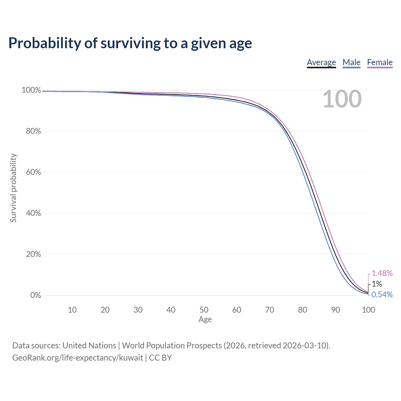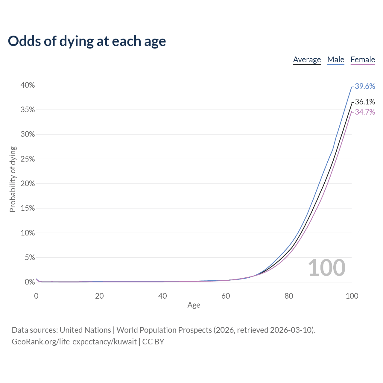 This life expectancy calculator shows the odds of living to 100, 95, 90, and below based on current age for both males and females in Kuwait, along with mean and median age of death. The calculations are based on the 2026 life tables (actuarial tables) from the UN World Population Prospects.