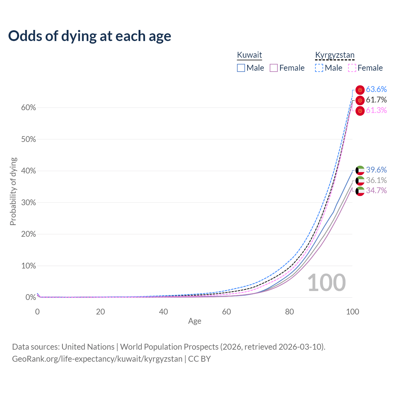 This life expectancy calculator shows the odds of living to 100, 95, 90, and below based on current age for both males and females in Kuwait and Kyrgyzstan, along with mean and median age of death. The calculations are based on the 2026 life tables (actuarial tables) from the UN World Population Prospects.