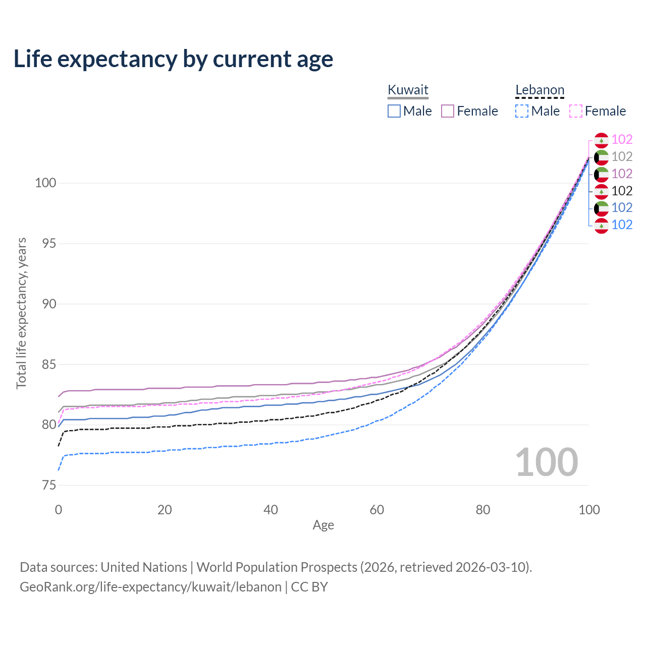This life expectancy calculator shows the odds of living to 100, 95, 90, and below based on current age for both males and females in Kuwait and Lebanon, along with mean and median age of death. The calculations are based on the 2026 life tables (actuarial tables) from the UN World Population Prospects.