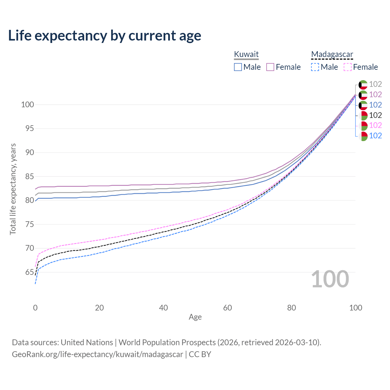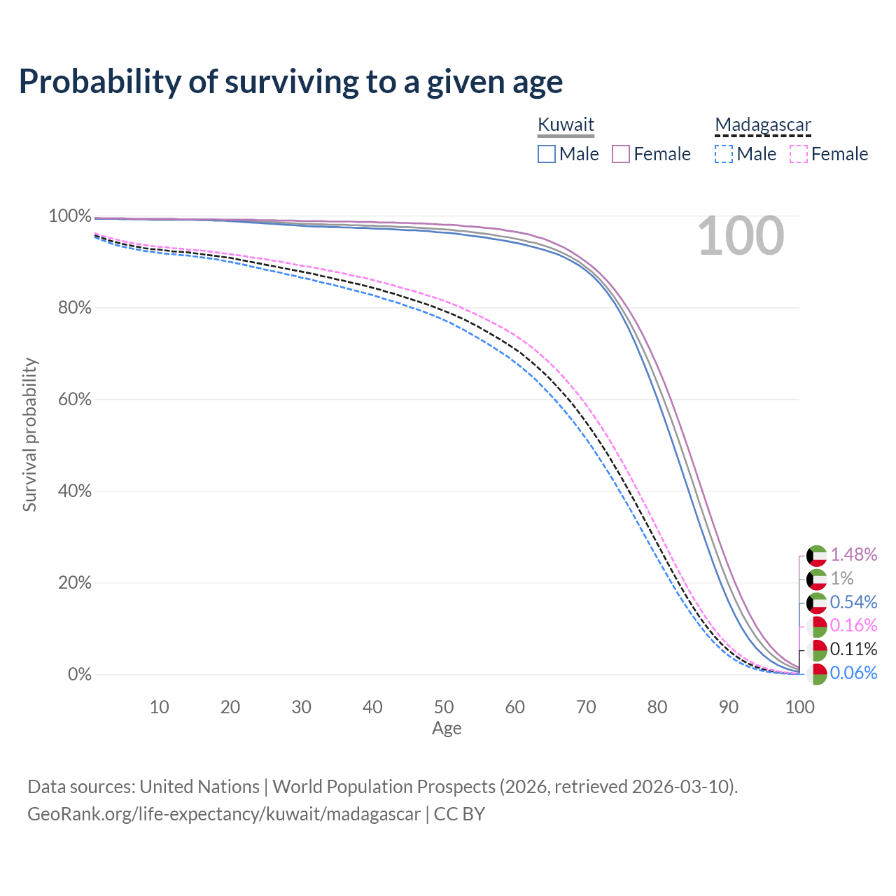 This life expectancy calculator shows the odds of living to 100, 95, 90, and below based on current age for both males and females in Kuwait and Madagascar, along with mean and median age of death. The calculations are based on the 2026 life tables (actuarial tables) from the UN World Population Prospects.