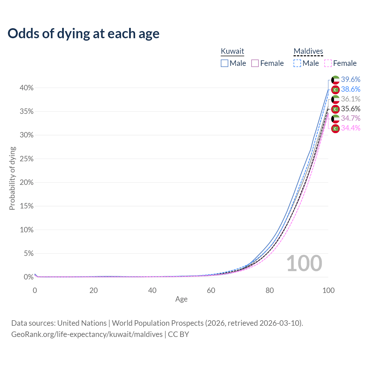 This life expectancy calculator shows the odds of living to 100, 95, 90, and below based on current age for both males and females in Kuwait and Maldives, along with mean and median age of death. The calculations are based on the 2026 life tables (actuarial tables) from the UN World Population Prospects.