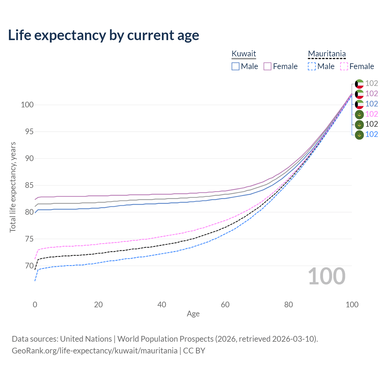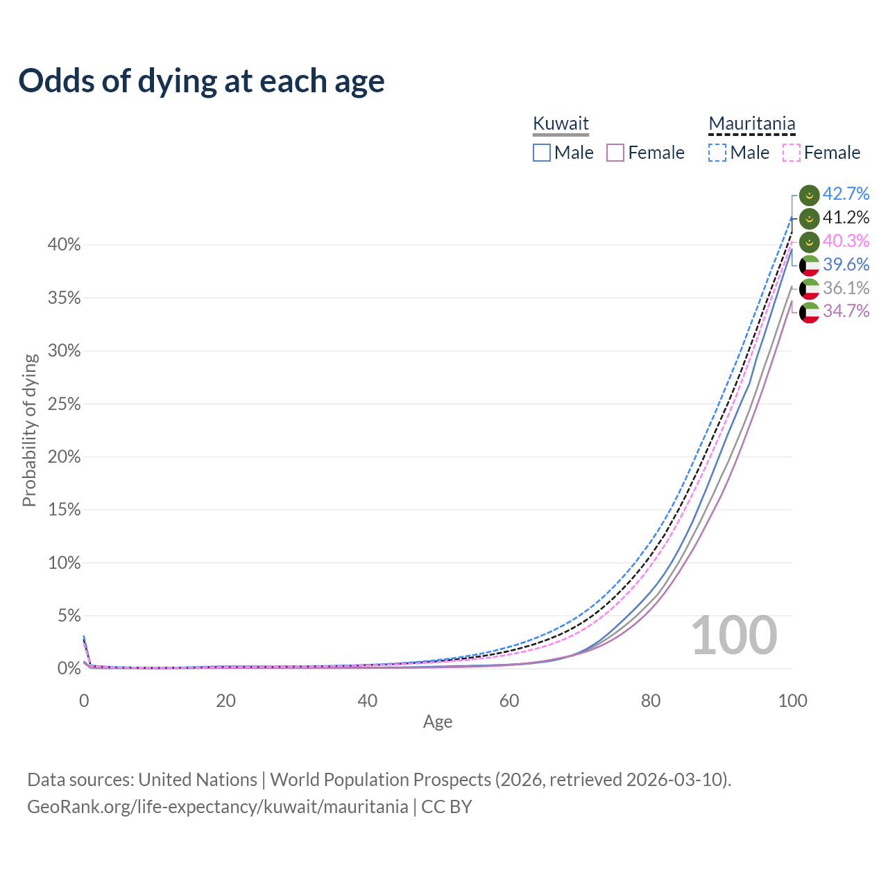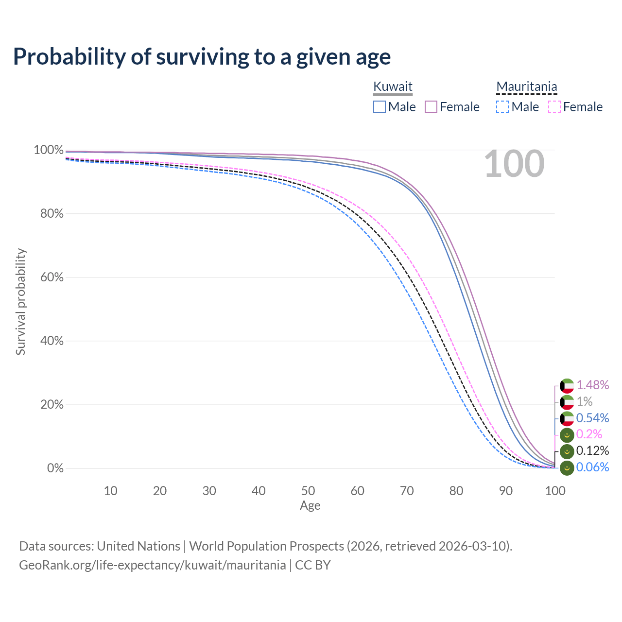 This life expectancy calculator shows the odds of living to 100, 95, 90, and below based on current age for both males and females in Kuwait and Mauritania, along with mean and median age of death. The calculations are based on the 2026 life tables (actuarial tables) from the UN World Population Prospects.