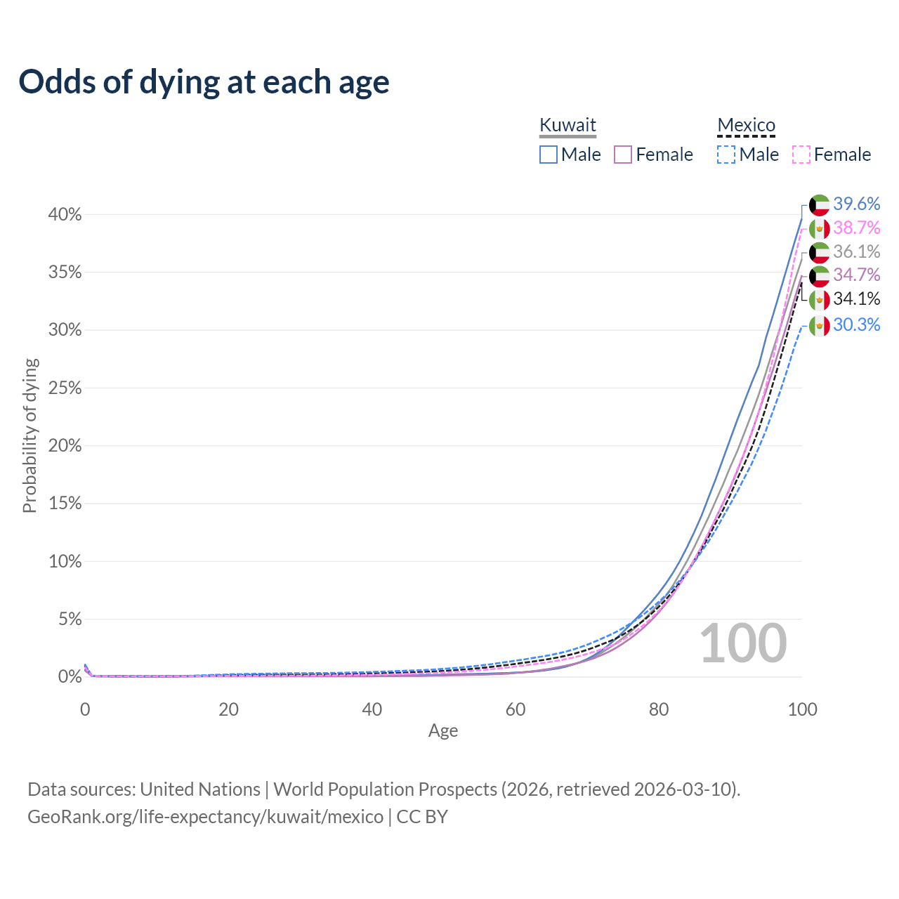 This life expectancy calculator shows the odds of living to 100, 95, 90, and below based on current age for both males and females in Kuwait and Mexico, along with mean and median age of death. The calculations are based on the 2026 life tables (actuarial tables) from the UN World Population Prospects.