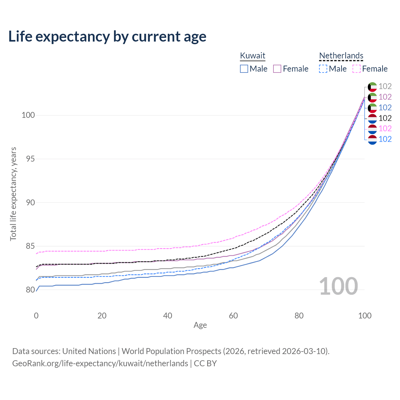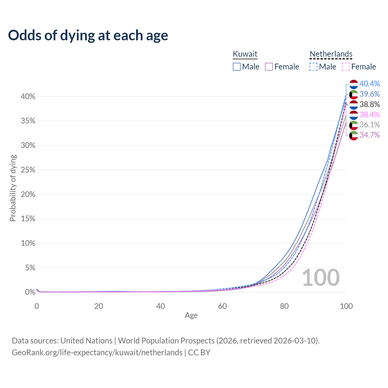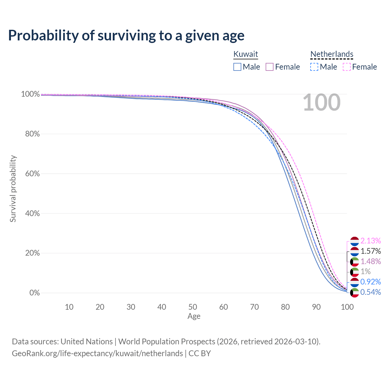 This life expectancy calculator shows the odds of living to 100, 95, 90, and below based on current age for both males and females in Kuwait and the Netherlands, along with mean and median age of death. The calculations are based on the 2026 life tables (actuarial tables) from the UN World Population Prospects.