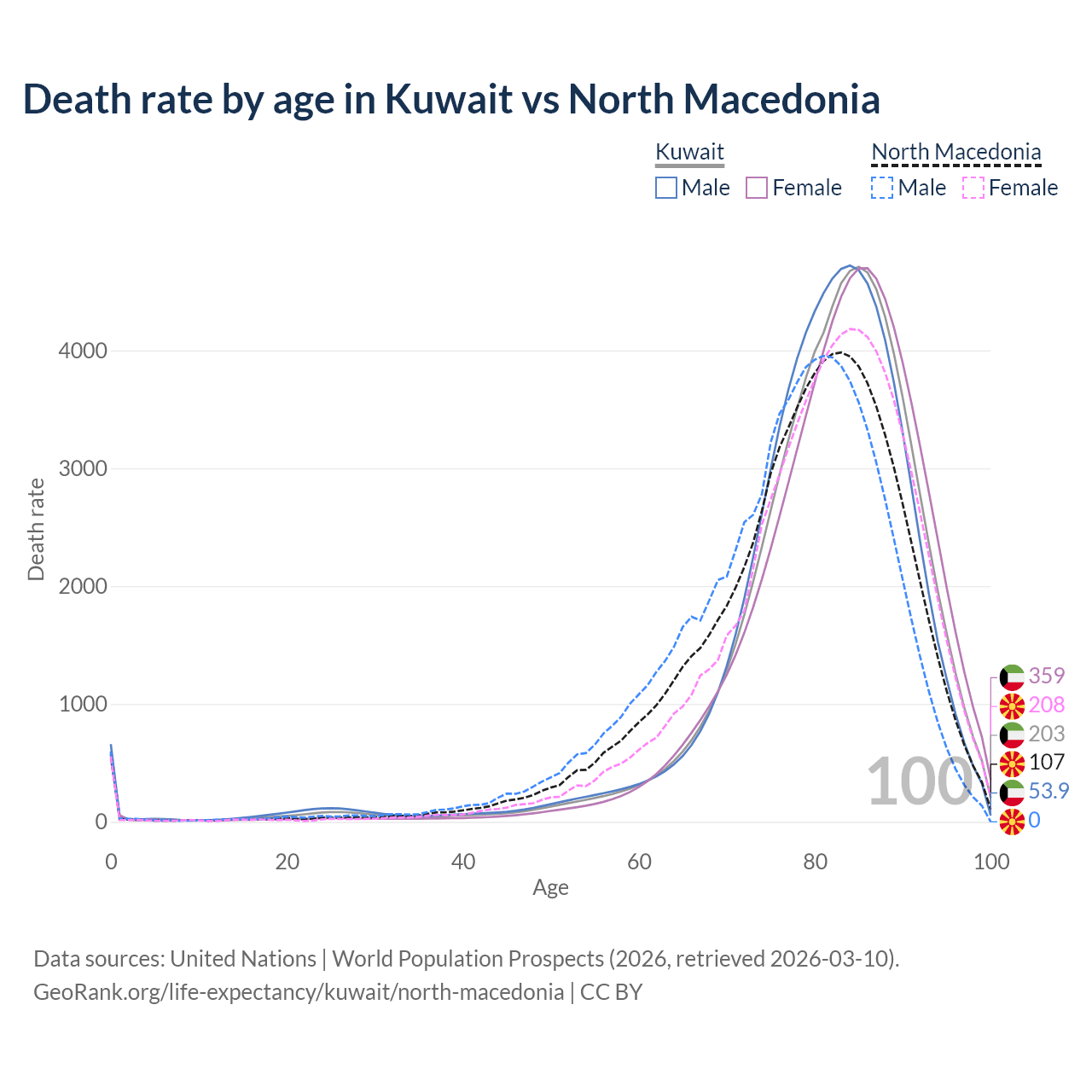 In Kuwait, the most common age of death is 85, compared to 83 in North Macedonia. The median age of death is 83.3 in Kuwait and 80.3 in North Macedonia, meaning only half of each cohort is expected to live past that age.