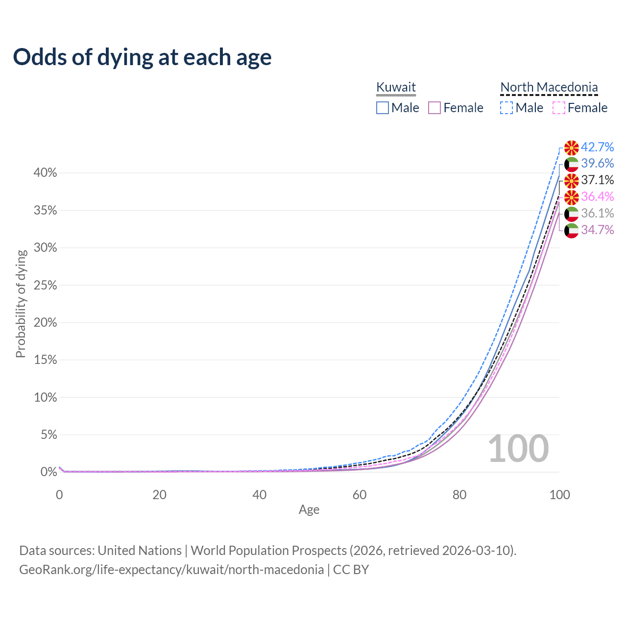 This life expectancy calculator shows the odds of living to 100, 95, 90, and below based on current age for both males and females in Kuwait and North Macedonia, along with mean and median age of death. The calculations are based on the 2026 life tables (actuarial tables) from the UN World Population Prospects.