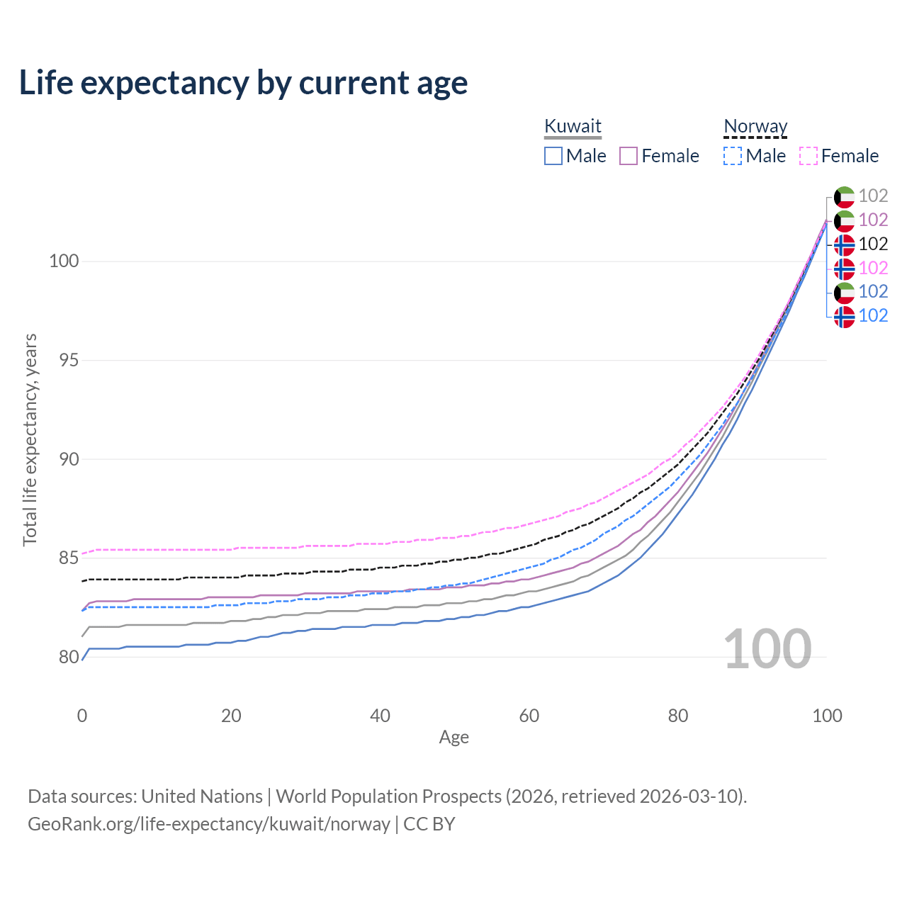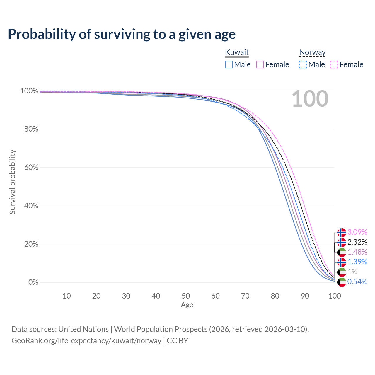 This life expectancy calculator shows the odds of living to 100, 95, 90, and below based on current age for both males and females in Kuwait and Norway, along with mean and median age of death. The calculations are based on the 2026 life tables (actuarial tables) from the UN World Population Prospects.