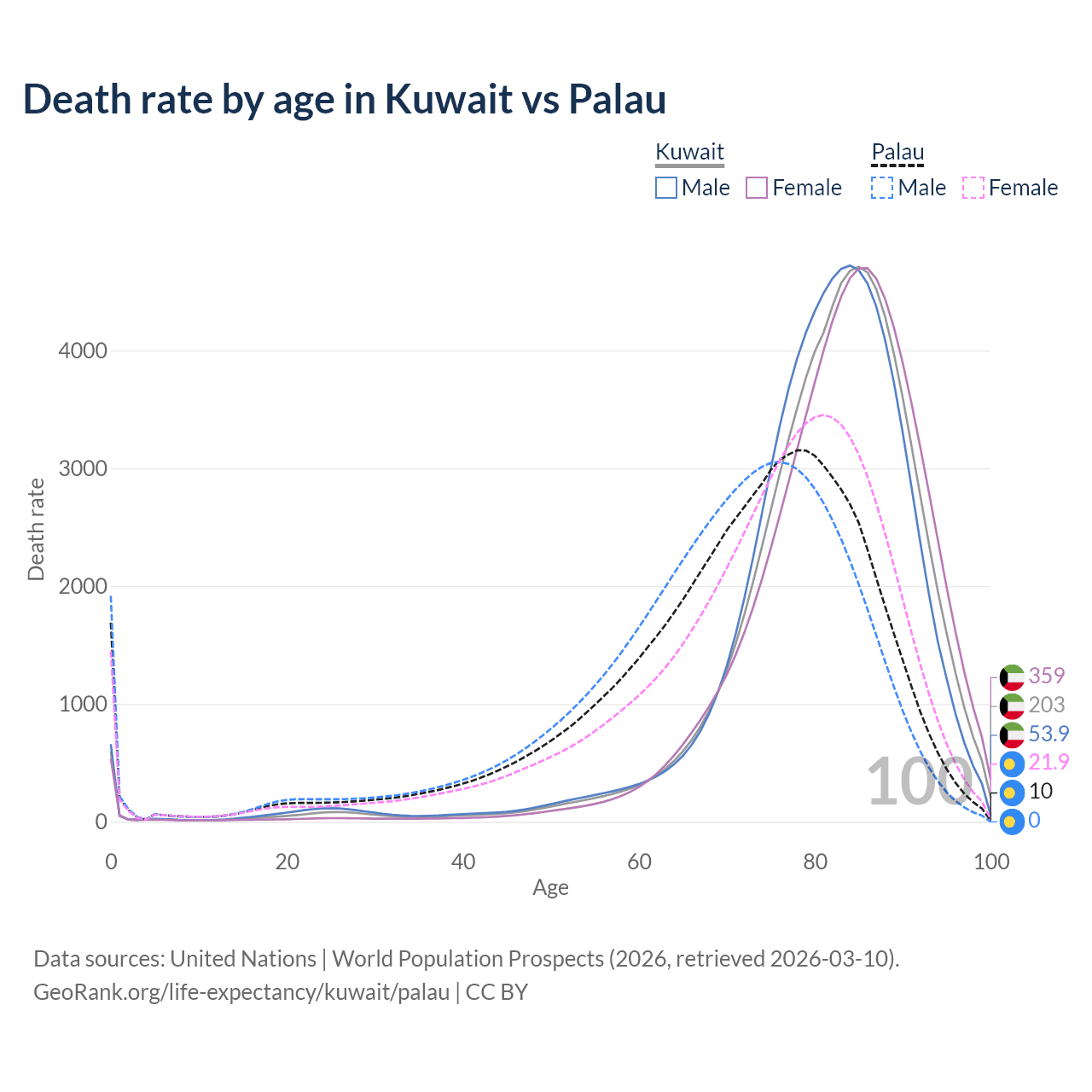 This life expectancy calculator shows the odds of living to 100, 95, 90, and below based on current age for both males and females in Kuwait and Palau, along with mean and median age of death. The calculations are based on the 2026 life tables (actuarial tables) from the UN World Population Prospects.