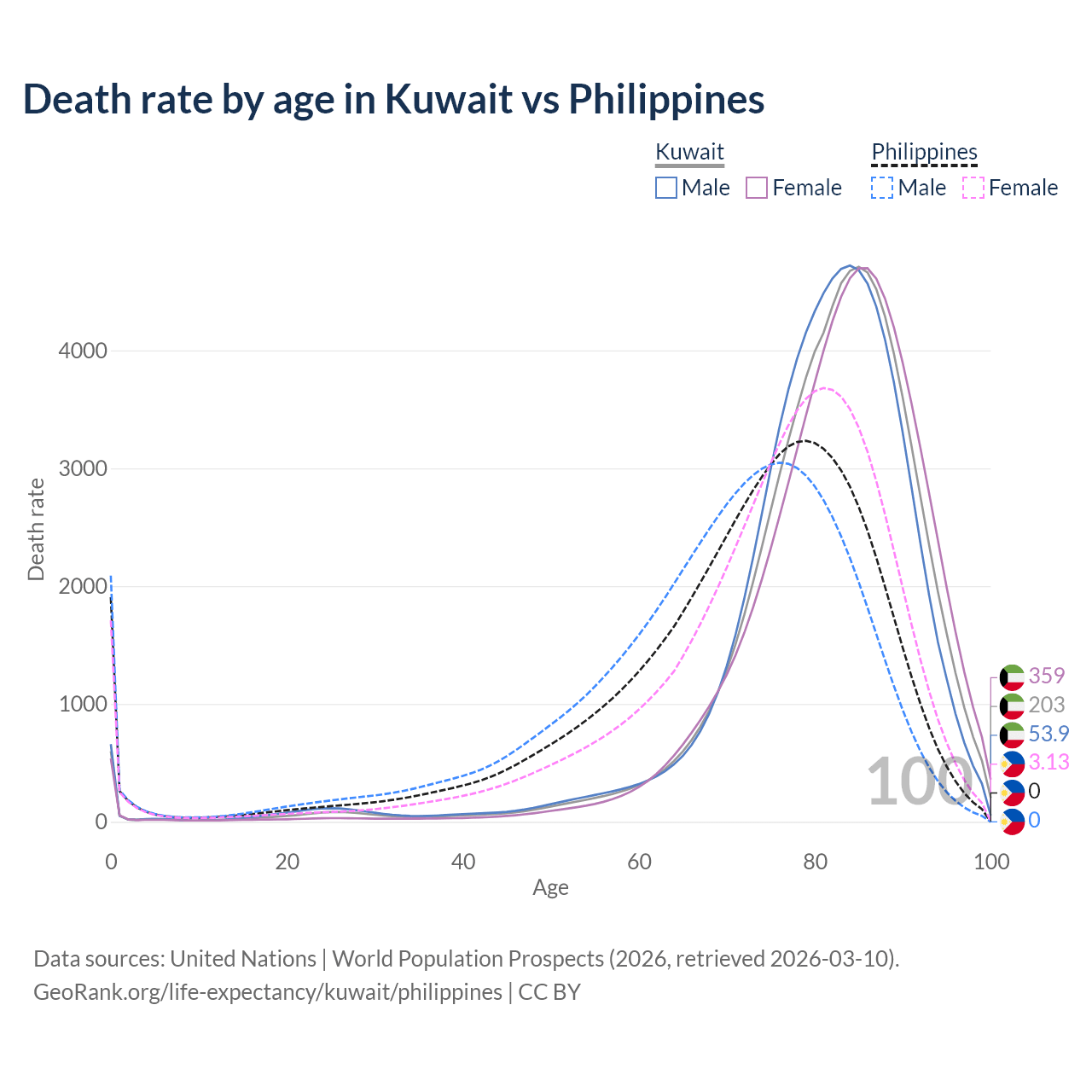 In Kuwait, the most common age of death is 85, compared to 79 in the Philippines. The median age of death is 83.3 in Kuwait and 74.6 in the Philippines, meaning only half of each cohort is expected to live past that age.
