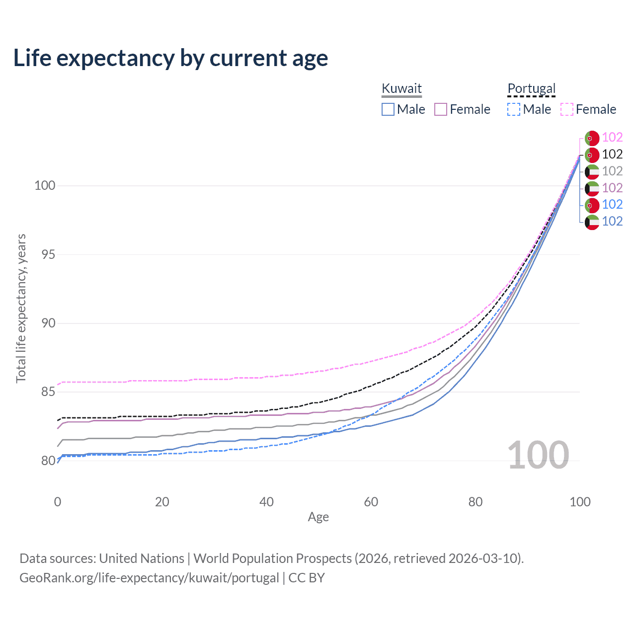 This life expectancy calculator shows the odds of living to 100, 95, 90, and below based on current age for both males and females in Kuwait and Portugal, along with mean and median age of death. The calculations are based on the 2026 life tables (actuarial tables) from the UN World Population Prospects.