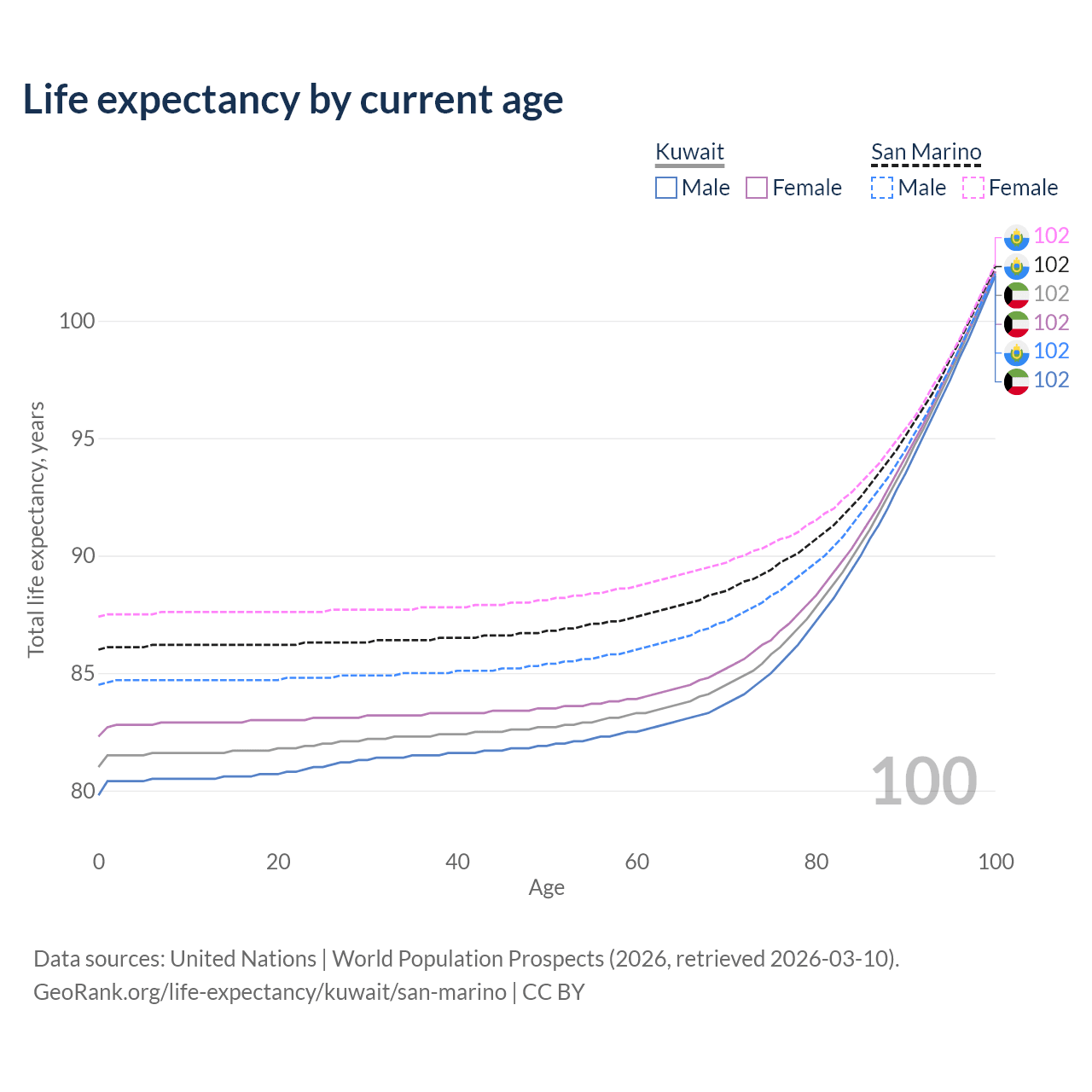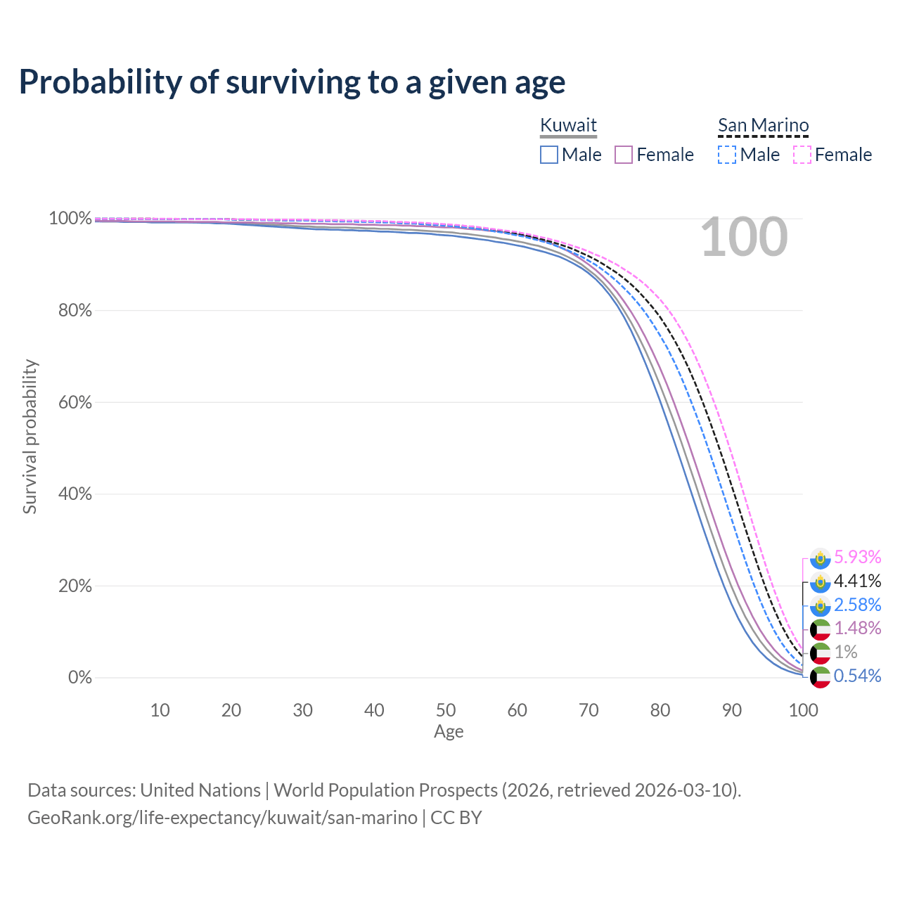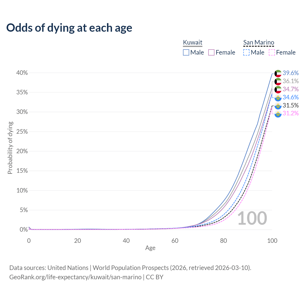 This life expectancy calculator shows the odds of living to 100, 95, 90, and below based on current age for both males and females in Kuwait and San Marino, along with mean and median age of death. The calculations are based on the 2026 life tables (actuarial tables) from the UN World Population Prospects.