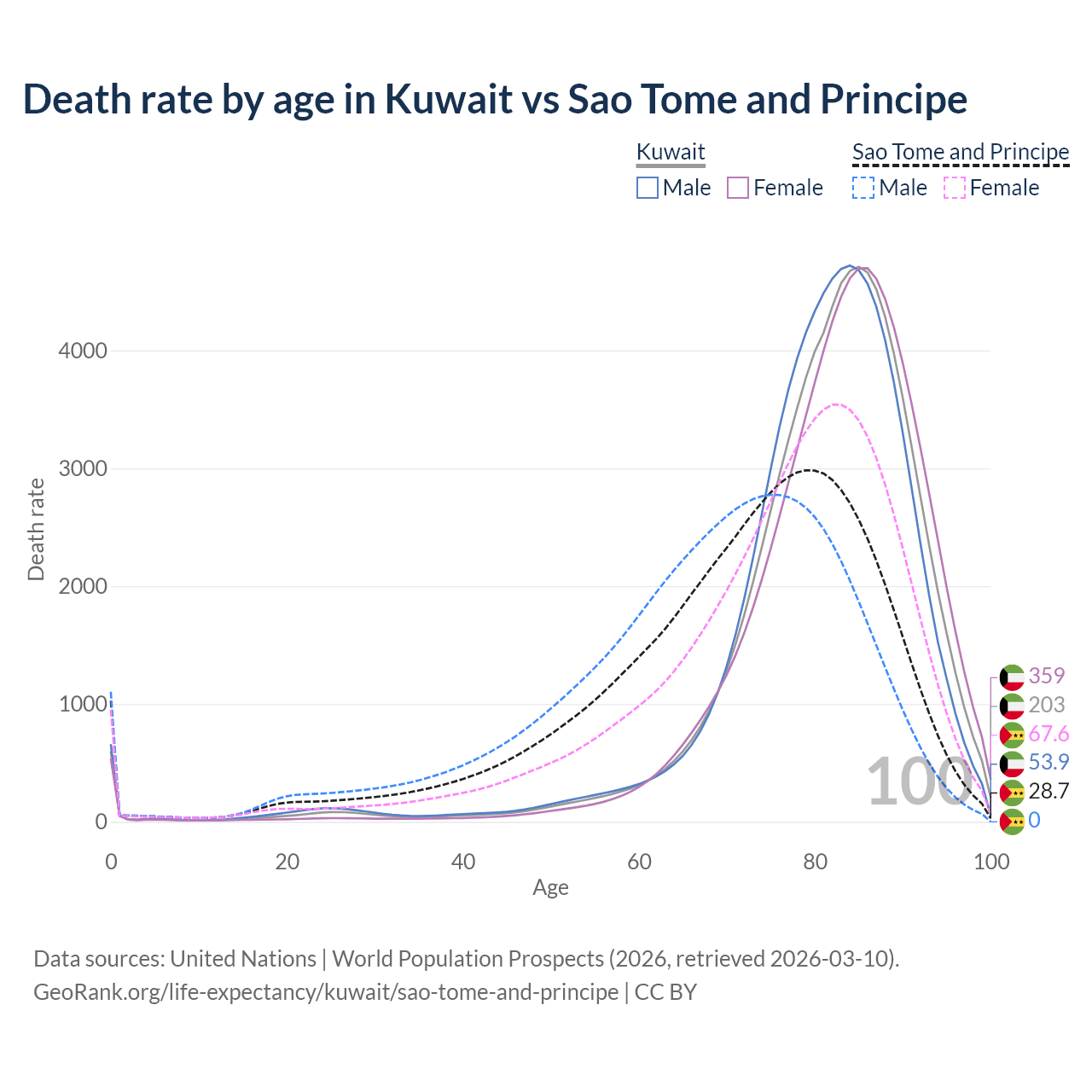 In Kuwait, the most common age of death is 85, compared to 79 in Sao Tome and Principe. The median age of death is 83.3 in Kuwait and 74.1 in Sao Tome and Principe, meaning only half of each cohort is expected to live past that age.