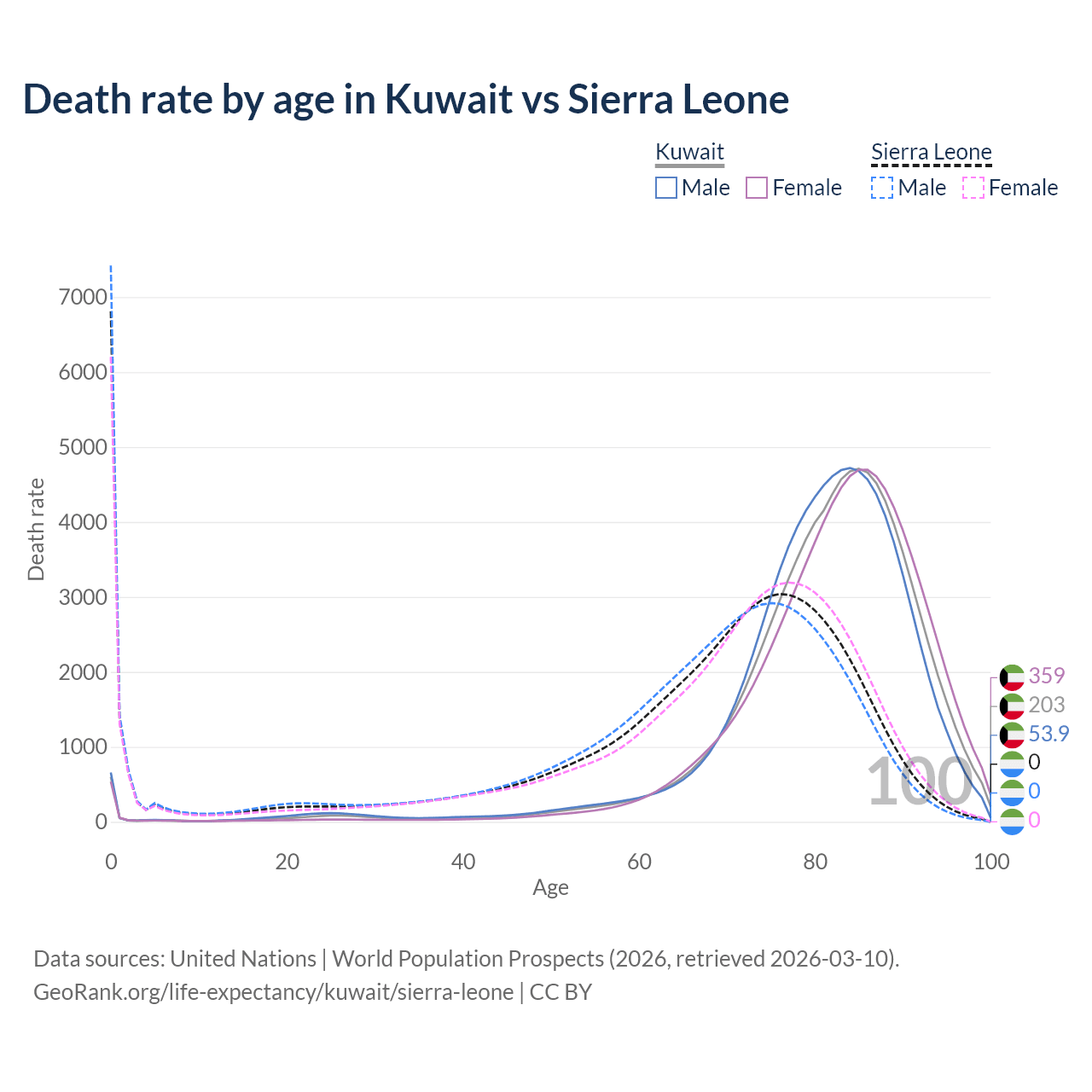 In Kuwait, the most common age of death is 85, compared to 0 in Sierra Leone. The median age of death is 83.3 in Kuwait and 70.8 in Sierra Leone, meaning only half of each cohort is expected to live past that age.
