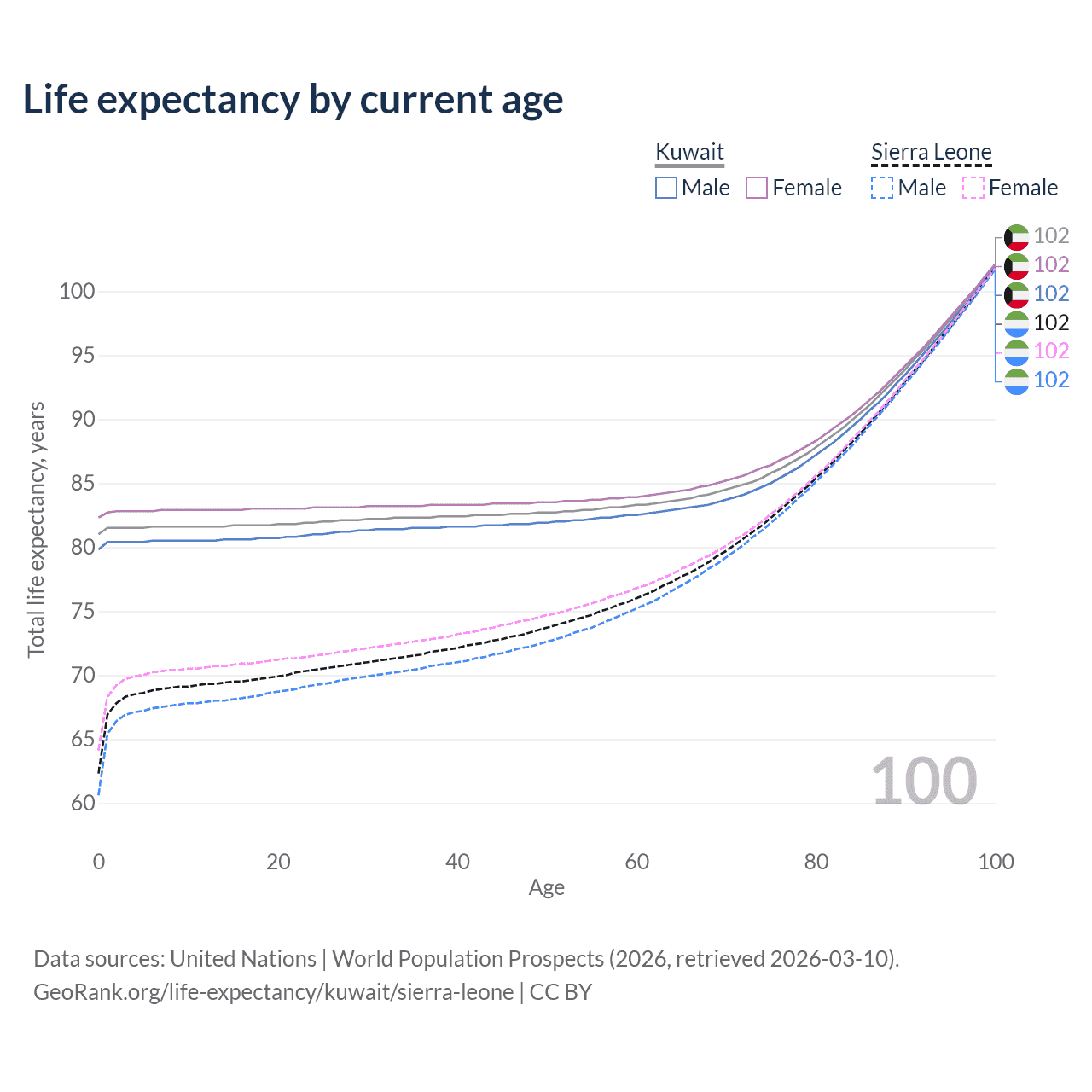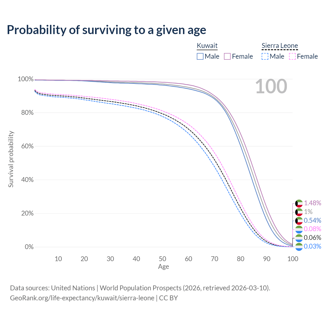 This life expectancy calculator shows the odds of living to 100, 95, 90, and below based on current age for both males and females in Kuwait and Sierra Leone, along with mean and median age of death. The calculations are based on the 2026 life tables (actuarial tables) from the UN World Population Prospects.