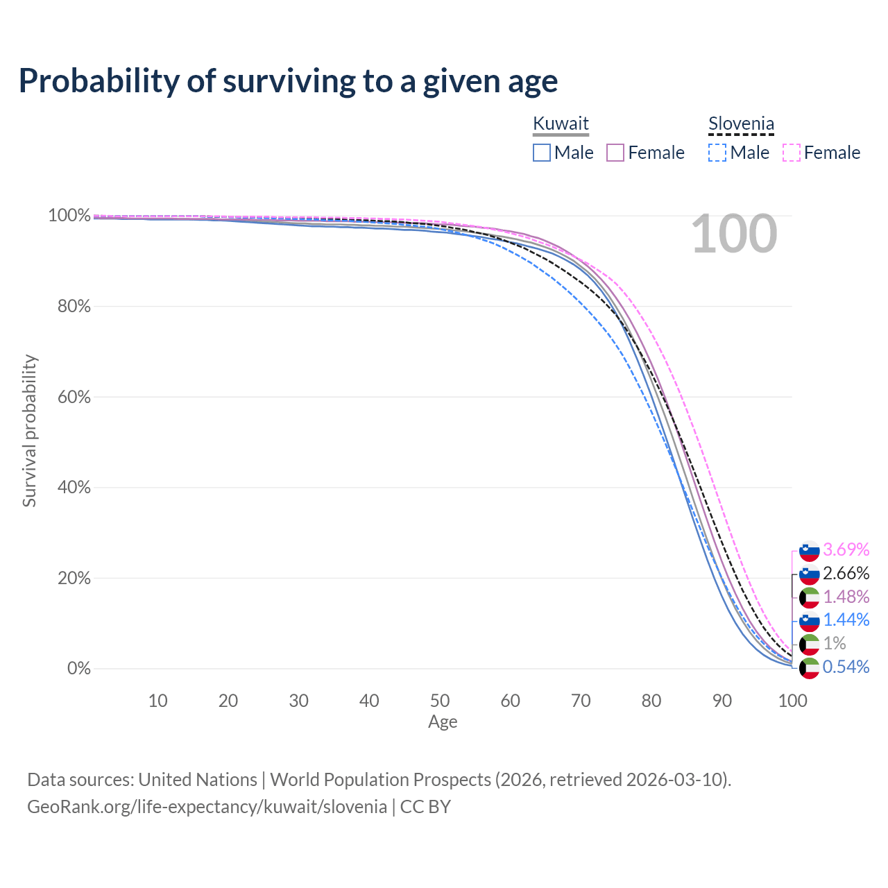 This life expectancy calculator shows the odds of living to 100, 95, 90, and below based on current age for both males and females in Kuwait and Slovenia, along with mean and median age of death. The calculations are based on the 2026 life tables (actuarial tables) from the UN World Population Prospects.