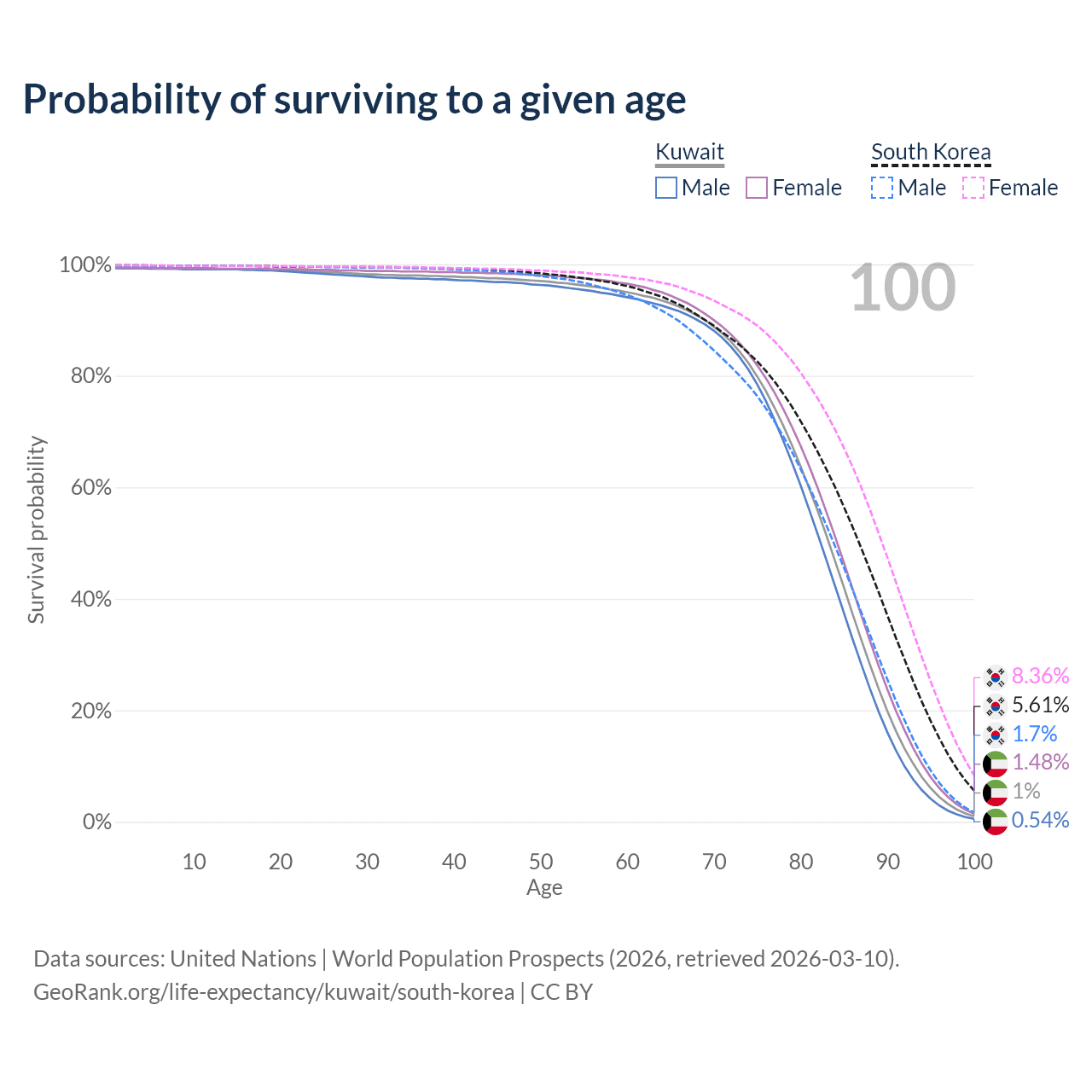 This life expectancy calculator shows the odds of living to 100, 95, 90, and below based on current age for both males and females in Kuwait and South Korea, along with mean and median age of death. The calculations are based on the 2026 life tables (actuarial tables) from the UN World Population Prospects.