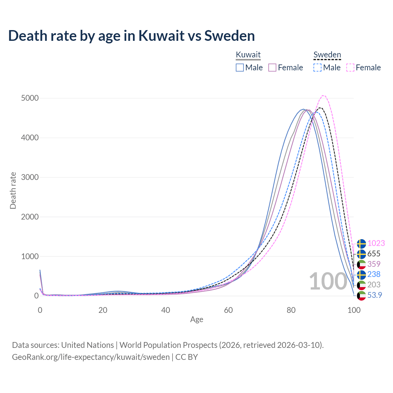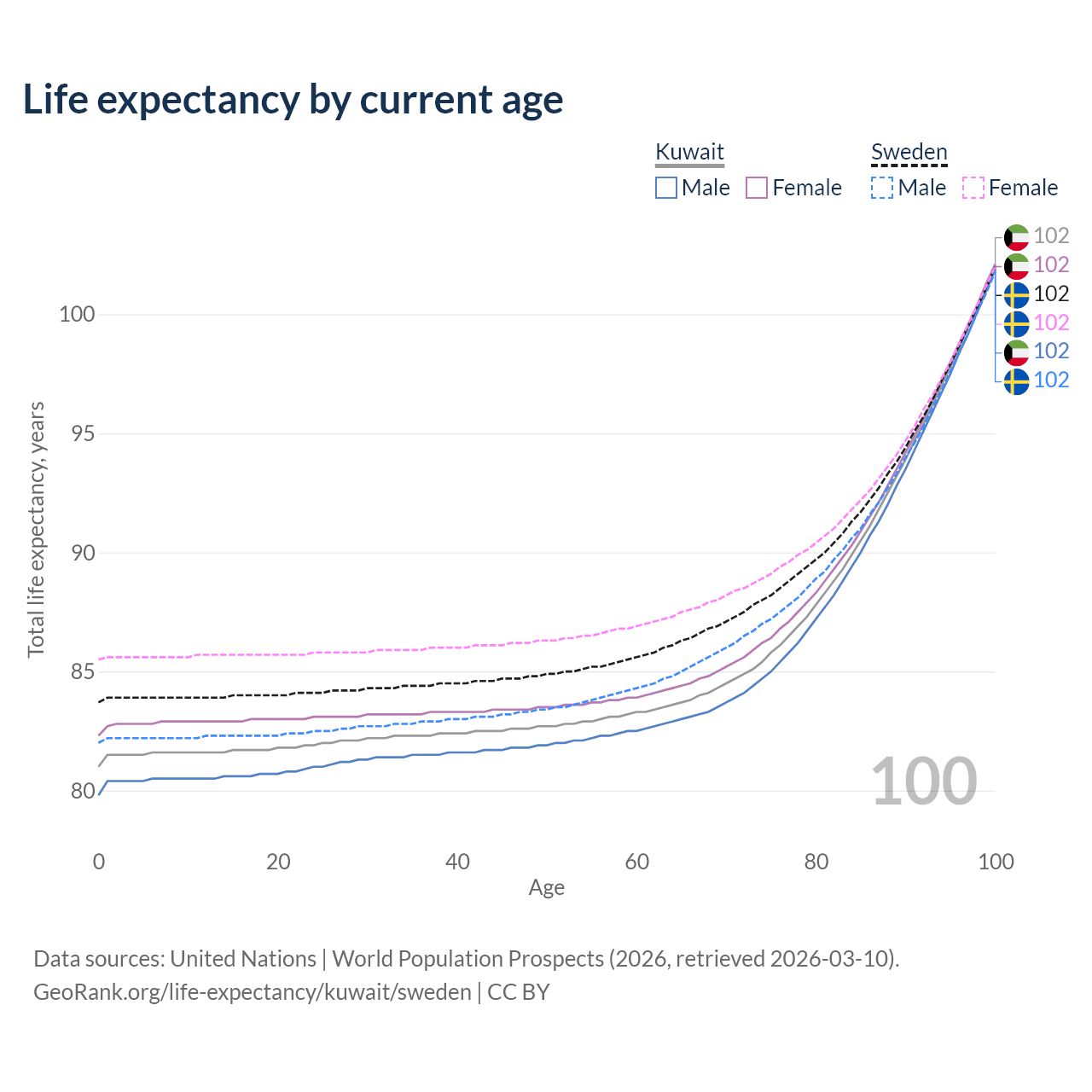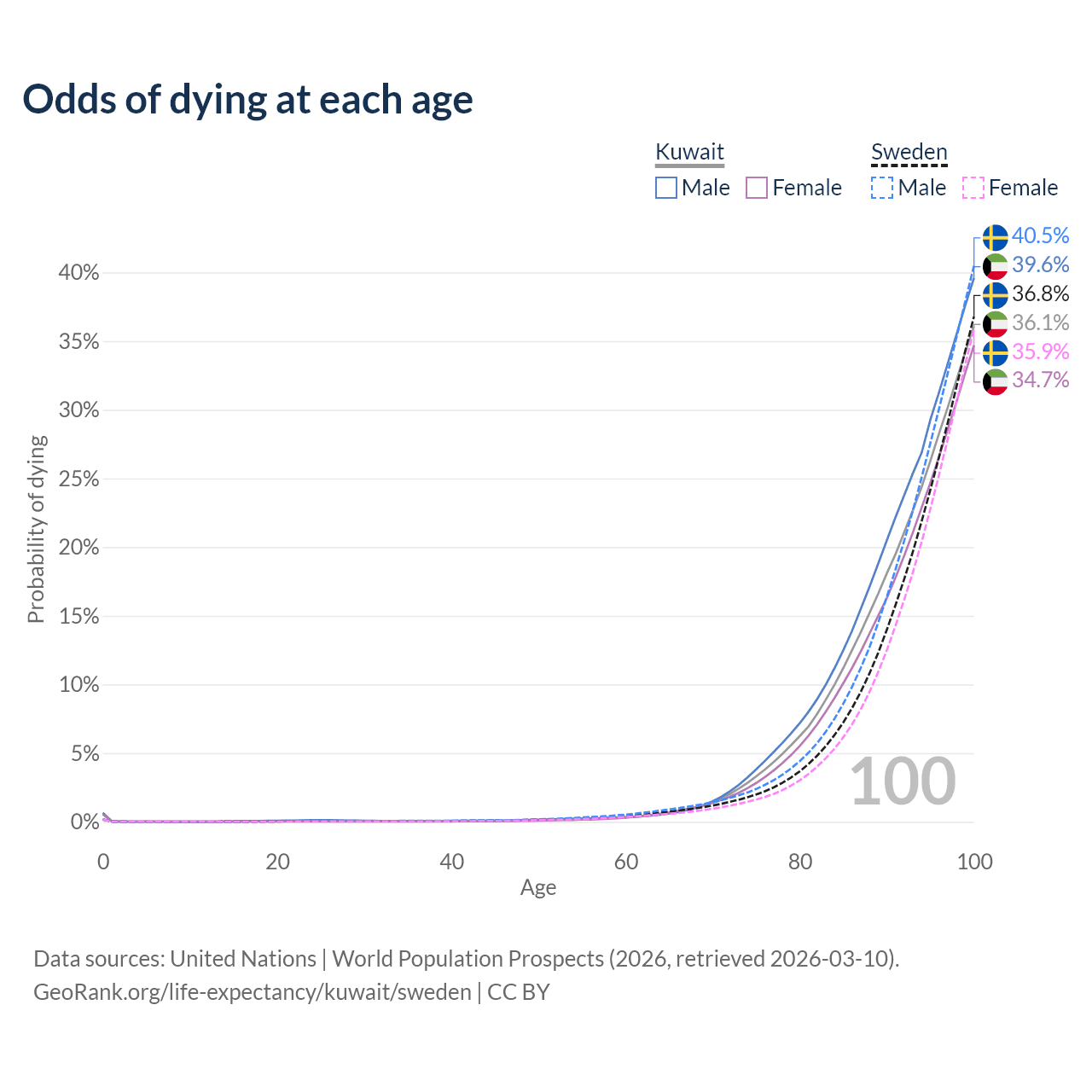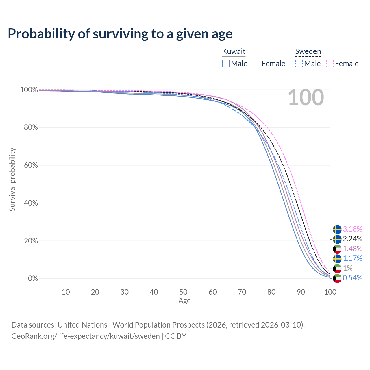 This life expectancy calculator shows the odds of living to 100, 95, 90, and below based on current age for both males and females in Kuwait and Sweden, along with mean and median age of death. The calculations are based on the 2026 life tables (actuarial tables) from the UN World Population Prospects.