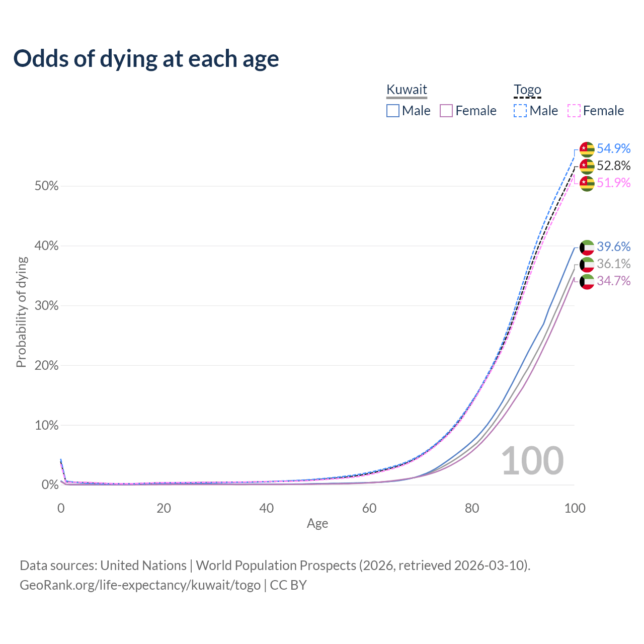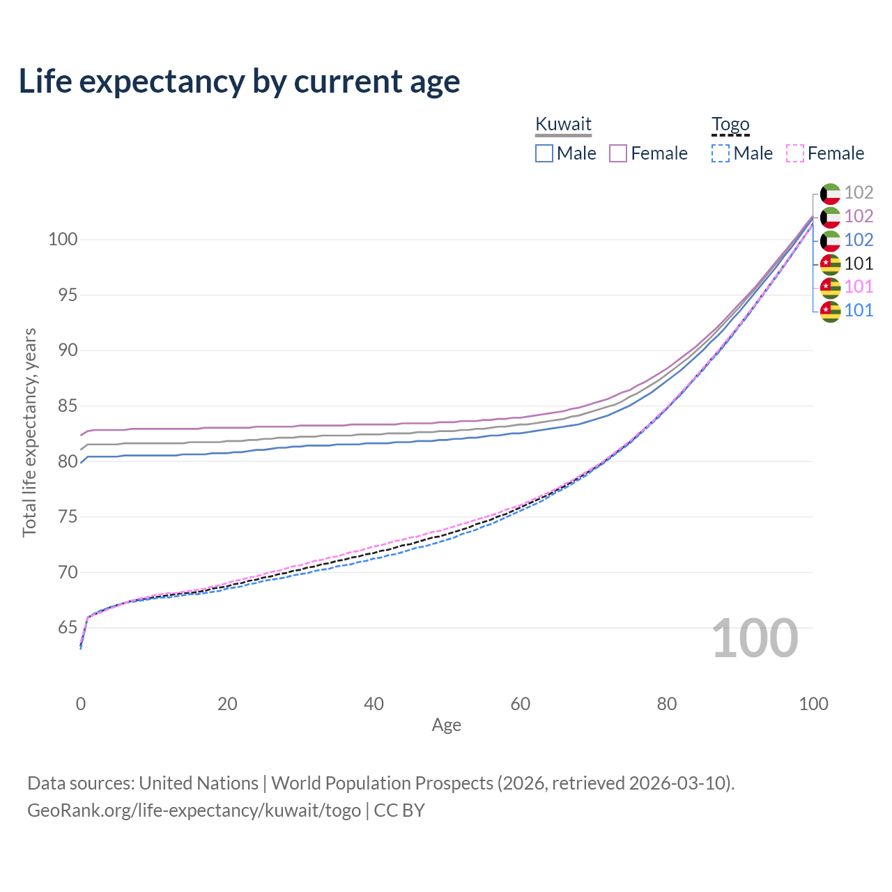 This life expectancy calculator shows the odds of living to 100, 95, 90, and below based on current age for both males and females in Kuwait and Togo, along with mean and median age of death. The calculations are based on the 2026 life tables (actuarial tables) from the UN World Population Prospects.