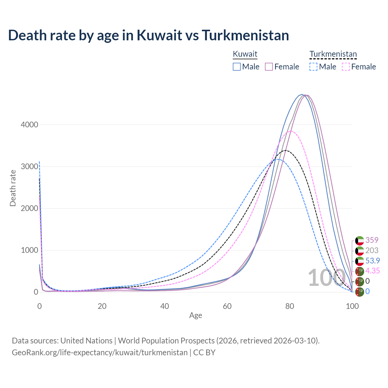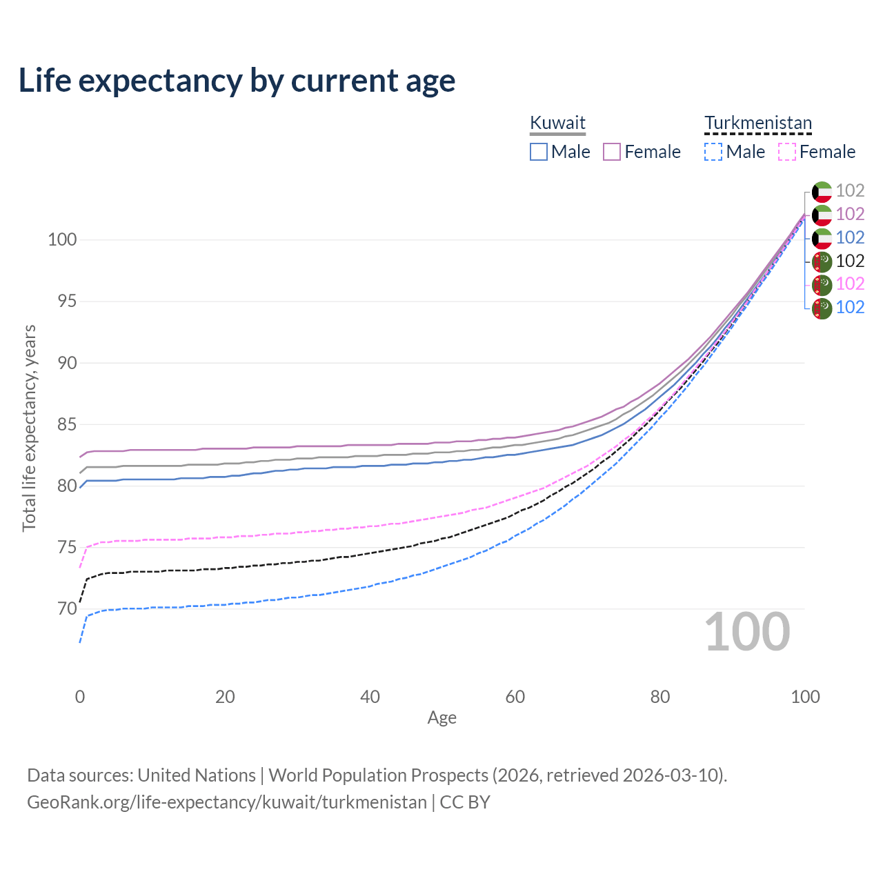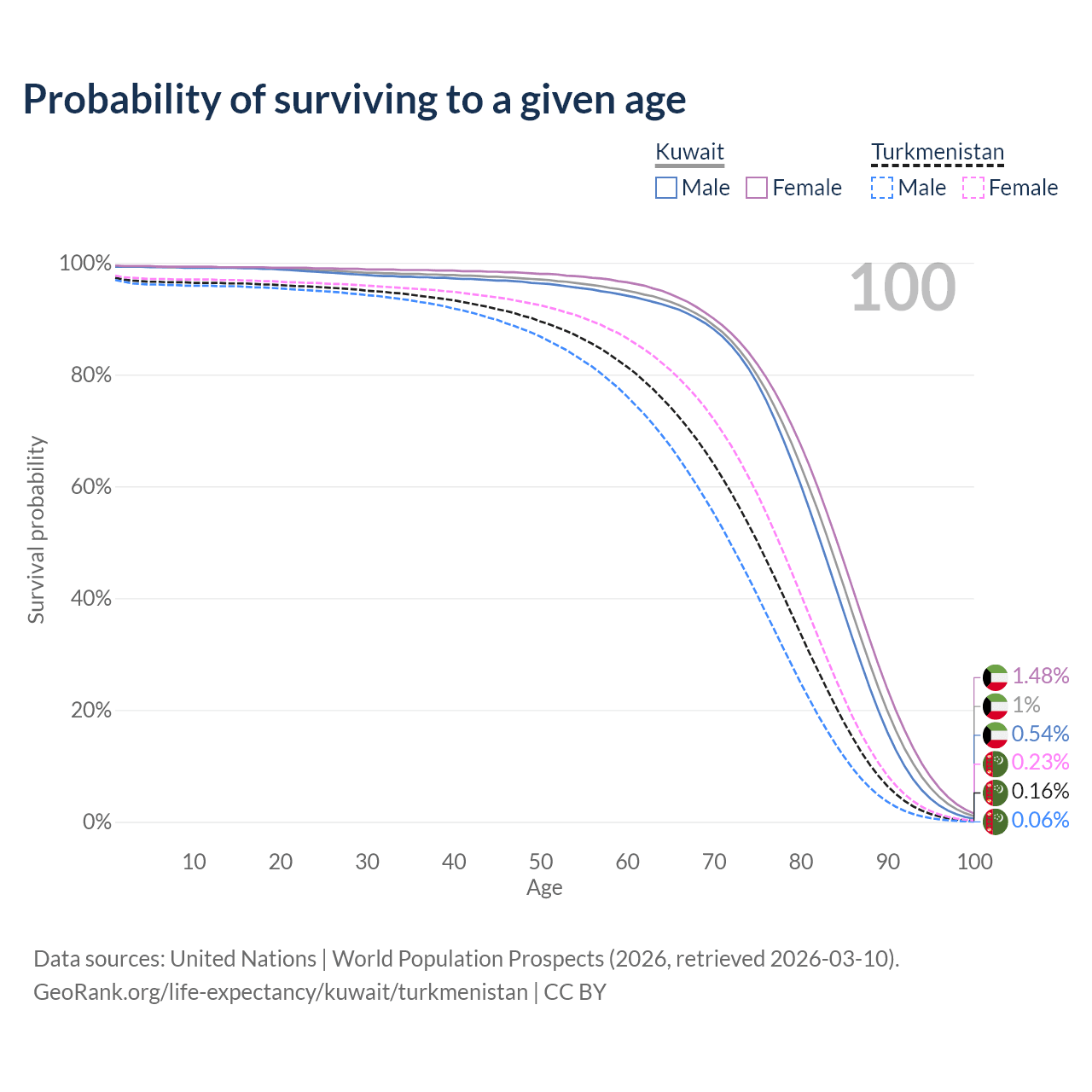 This life expectancy calculator shows the odds of living to 100, 95, 90, and below based on current age for both males and females in Kuwait and Turkmenistan, along with mean and median age of death. The calculations are based on the 2026 life tables (actuarial tables) from the UN World Population Prospects.
