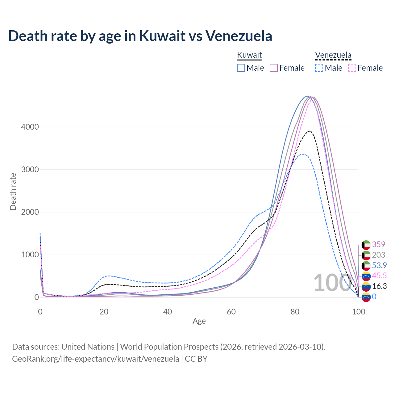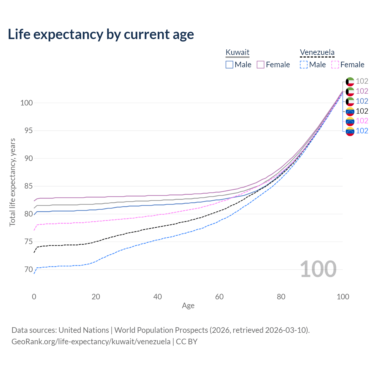 This life expectancy calculator shows the odds of living to 100, 95, 90, and below based on current age for both males and females in Kuwait and Venezuela, along with mean and median age of death. The calculations are based on the 2026 life tables (actuarial tables) from the UN World Population Prospects.