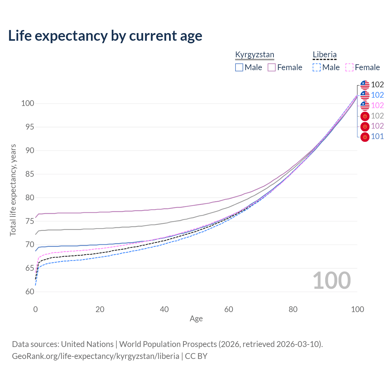 This life expectancy calculator shows the odds of living to 100, 95, 90, and below based on current age for both males and females in Kyrgyzstan and Liberia, along with mean and median age of death. The calculations are based on the 2026 life tables (actuarial tables) from the UN World Population Prospects.